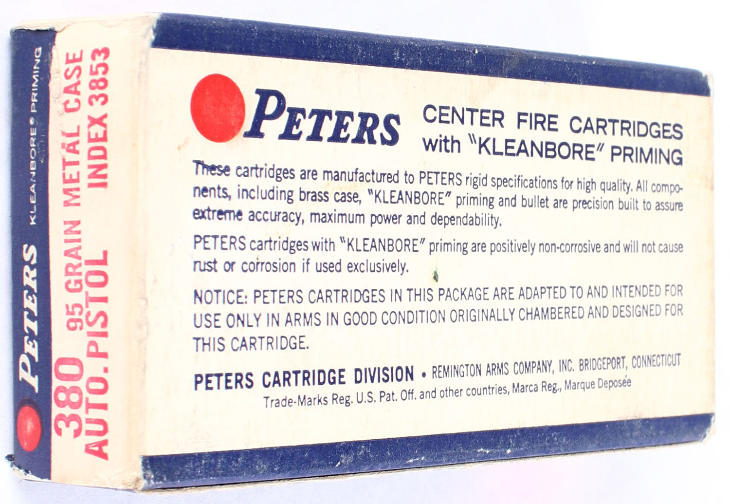 Peters, Center Fire Cartridges, .380 Automatic, 95 Grain Metal Case, Full, 1pc. Blue white & red box, box is solid with very good color, some age soiling & corner war, very minor edge wear, end flaps are solid, ammo is very good. Grade: Very Good ++ - Value: 20 to 30