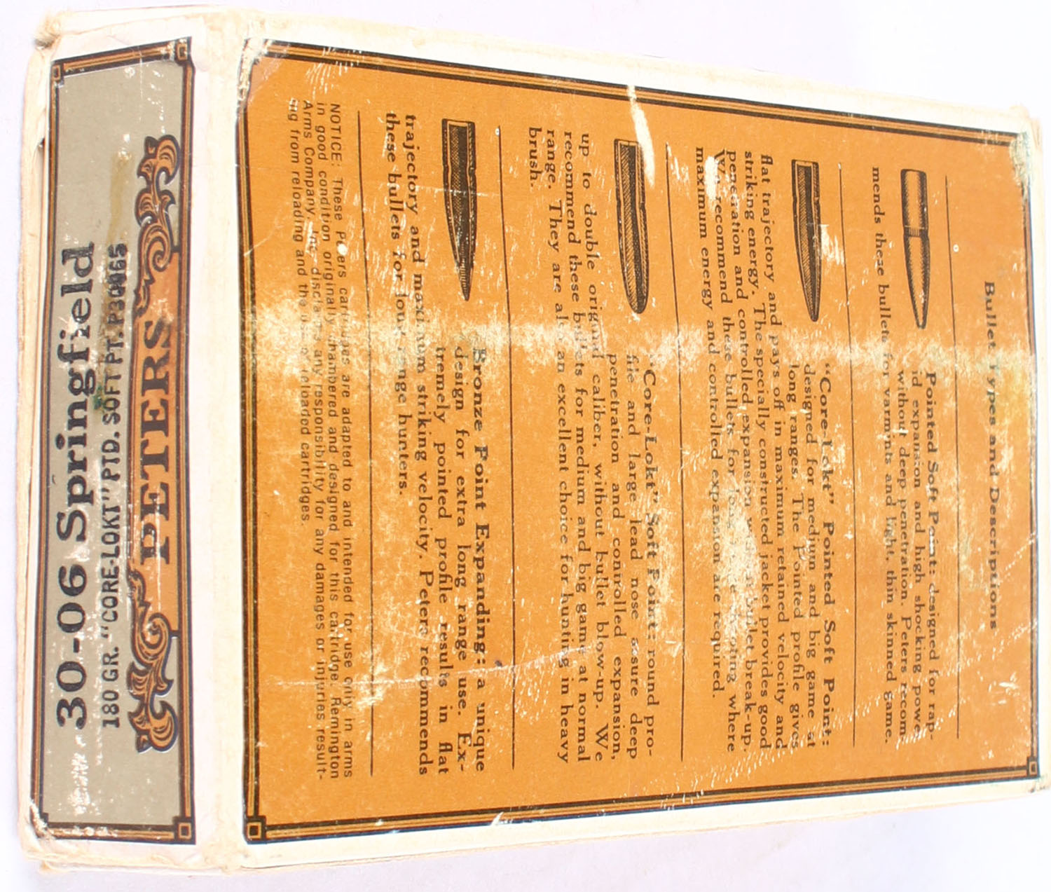 Peters, High Velocity Center Fire Cartridges, .30-06 Springfield, 180 Grain Core-Lokt Pointed Soft Point, Full, 1pc. Brown & black box, box has some age soiling with scuffing, edge & corner wear, end flaps are solid, ammo is very good. Grade: Good ++ - Value: 20 to 30