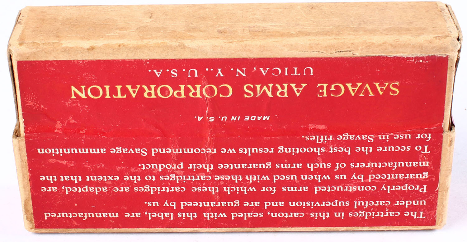 Savage, .250-3000 Savage, 87 Grain Metal Cased Bullet, Smokeless, FULL & SEALED, 2pc. Buff box with red & yellow label, box is very solid with excellent color, has rub marks with light corner wear, label in 90% intact. Grade: Excellent + - Value: 200 to 400