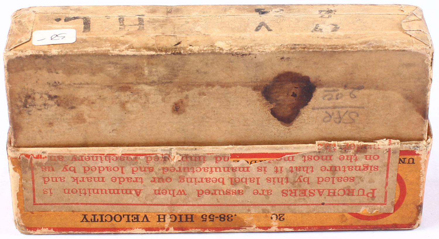 U.S., Smokeless Central Fire Cartridges, .38-55 Winchester High Velocity, Soft Point Bullets, Full, 2pc. Buff box with orange & red label, box has scuffing with soiling, has edge & corner wear, label is 90% intact, ammo is fair. Grade: Good + - Value: 20 to 60