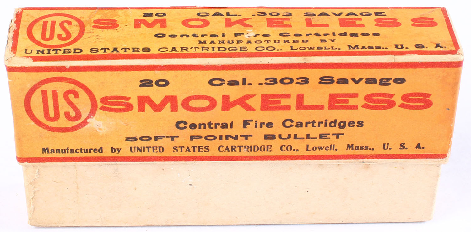U.S., Smokeless Central Fire Cartridges, .303 Savage, FULL & SEALED, 2pc. Buff box with orange & red labels, box is solid with excellent color, very minor age soiling, corners are mostly sharp, edges are crisp, labels are intact. Grade: Excellent ++ - Value: 100 to 150