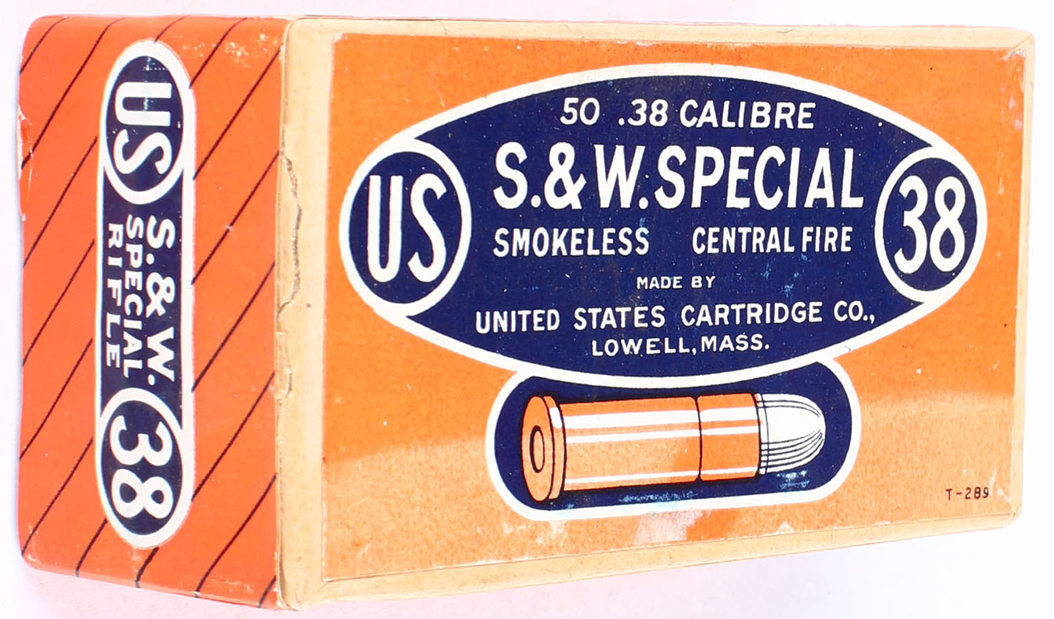 U.S., Smokeless Central Fire, .38 Smith & Wesson Special Rifle, FULL & SEALED, 2pc. Buff box with orange & blue label, box is very solid with excellent color, has very minor shelf wear wear with minor color fading to top, label is intact. Grade: Excellent + - Value: 20 to 40