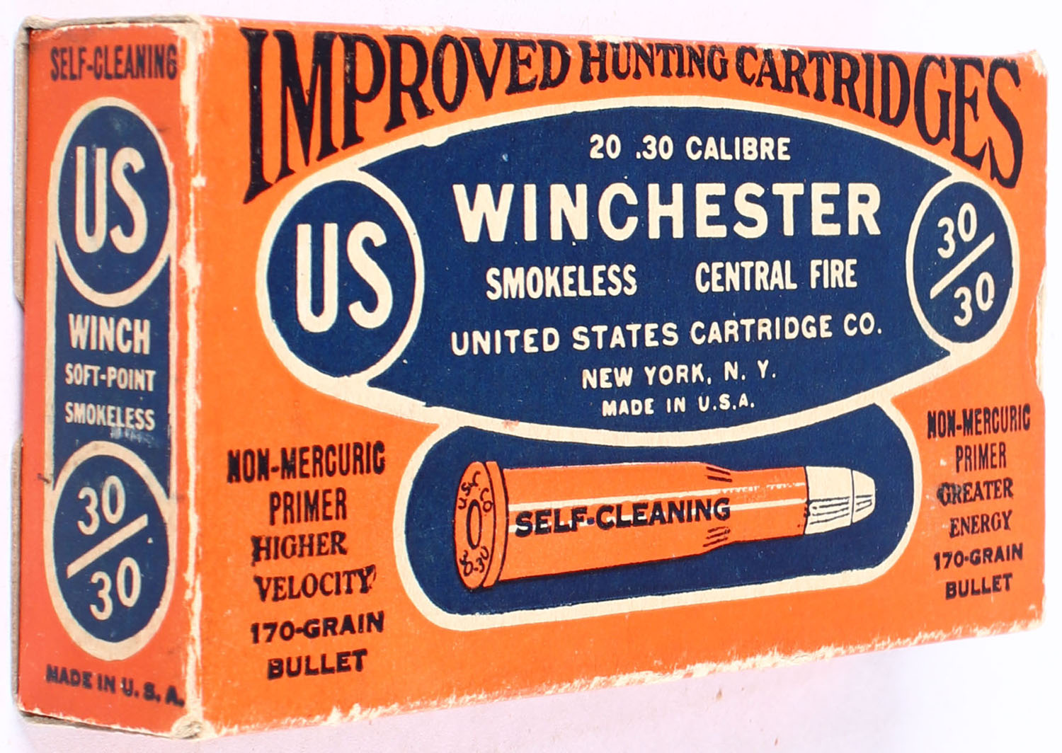 U.S., Smokeless Central Fire Cartridges, .30-30 Winchester, Full, 170 Grain, 1pc. Orange & blue box, box is very solid with excellent color, has light edge & corner wear, end flaps are solid, ammo is good to very good. Grade: Very Good ++ - Value: 20 to 60
