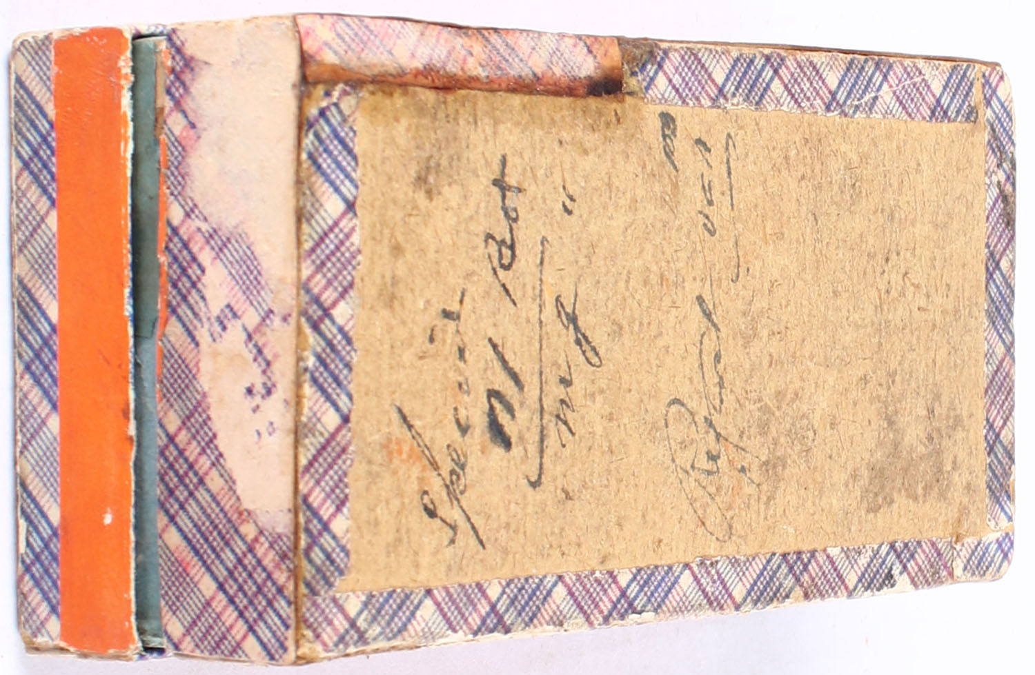 UMC, Rifle Cartridges, .44 Henry Rifle, Empty, 2pc. For extra long range, Purple fabric box with orange top & orange side sealing label, box is solid with good color, has age soiling with edge & corner wear, scuffing with writing to bottom. Grade: Good ++ - Value: 100 to 500