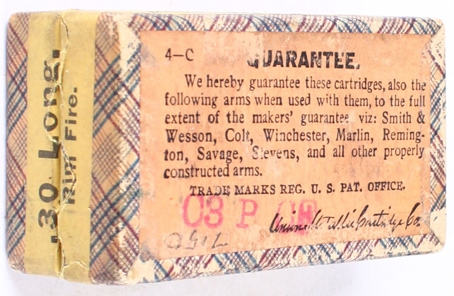 UMC, Rim Cartridges, .30 Long Cal., Full & Sealed, 2pc. plaid box with green top & side labels, box is solid with great color. Grade: Excellent + - Value: 50 to 150