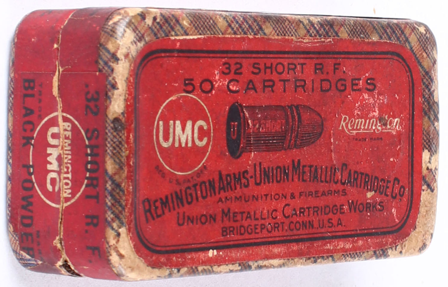 REM-UMC, .32 Short Rim Fire, Black Powder, Full, 2pc. Blue fabric box with red top & side sealing labels, box is solid with very good color, age soiling, shelf wear, edge & corner wear, labels are intact, ammo is good. Grade: Very Good + - Value: 30 to 90