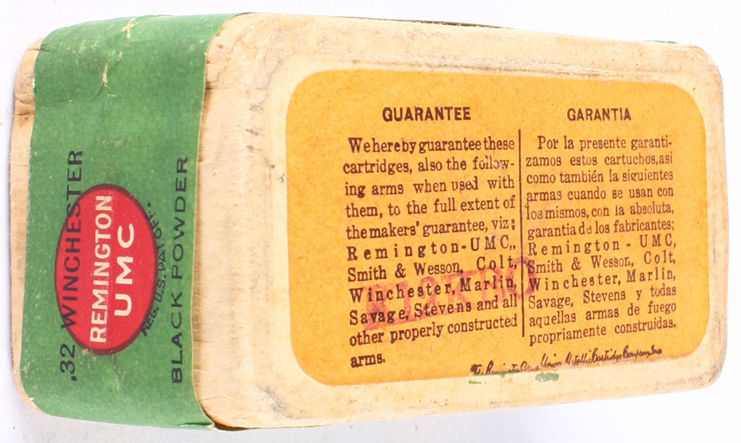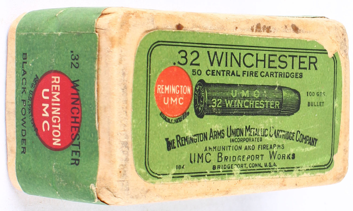 REM-UMC, Central Fire Cartridges, .32 Winchester, 100 Grs. Bullet, Black Powder, FULL & SEALED, 2pc. Buff box with green top & side sealing labels, box is very solid with excellent color, has corner wear, light edge wear, some age soiling. Grade: Excellent - Value: 40 to 80