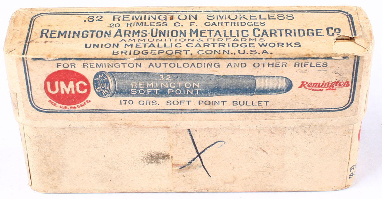 REM-UMC, .32 Remington, Smokeless Powder, 170 Grain Soft Point Bullet, FULL & SEALED, 2pc. Buff box with buff labels, box is solid with great color, minor age soiling, very minor edge & corner wear, front has been written on, labels are intact. Grade: Excellent - Value: 30 to 90
