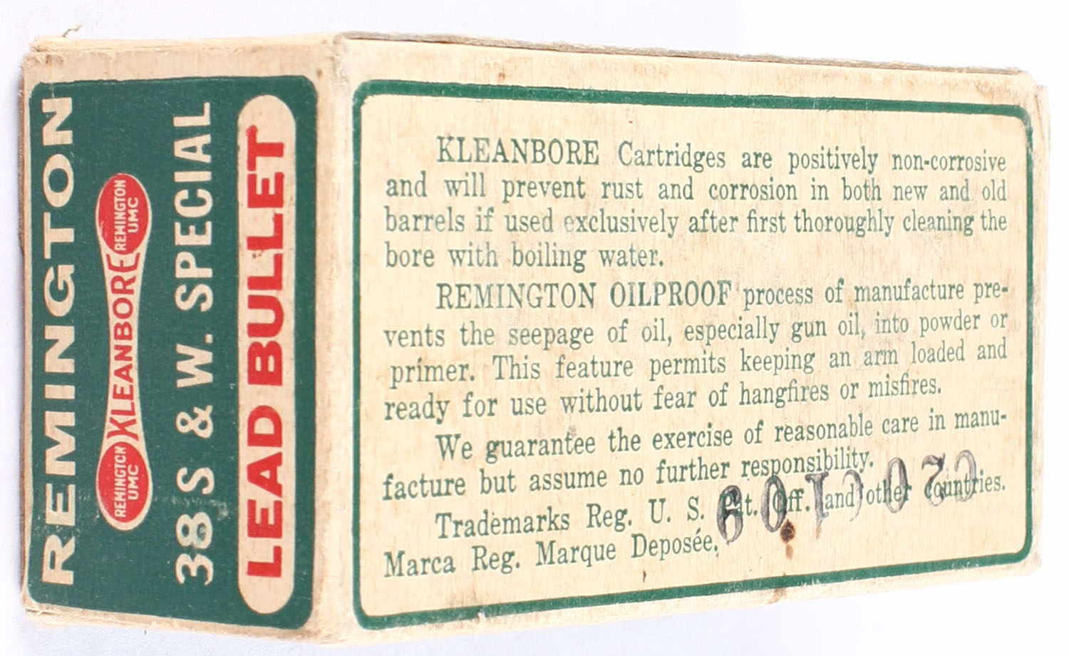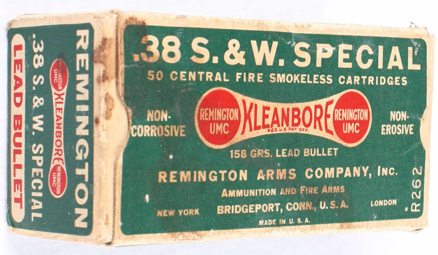 Remington Kleanbore, .38 Smith & Wesson Special, 158 Gr. Lead Bullet, 1pc, Partial 29rds., green & white/red box, box is solid with some age soiling, ammo is excellent. Grade: Very Good - Value: 10 to 40