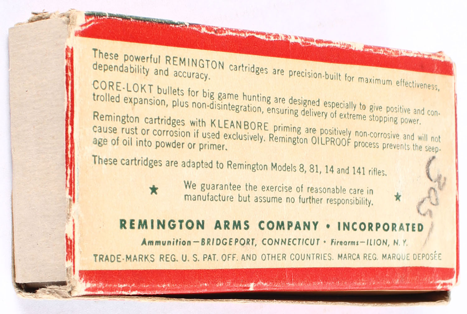 Remington, Kleanbore Express, .32 Remington, 170 Grain Soft Point Bullet, Full, 1pc. Green red & white box, box is solid with with one torn end flap, ammo is excellent. Grade: Very Good - Value: 20 to 60