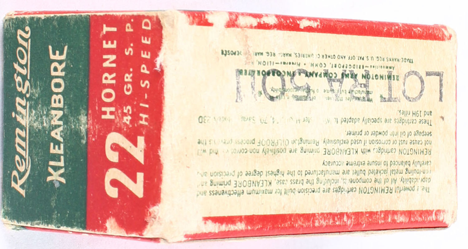 Remington, Kleanbore Hi-Speed, 22 Hornet, 45 Grain Soft Point Bullet, Full, 1pc. Green red & white box, box is solid with edge wear, very nice colors, end flaps are solid, ammo is excellent, has RARE side label stating to NOT USE AGAINST YOUR ENEMY BUT TO USE IS AS SURVIVAL CONDITIONS ONLY. Grade: Very Good ++ - Value: 50 to 200