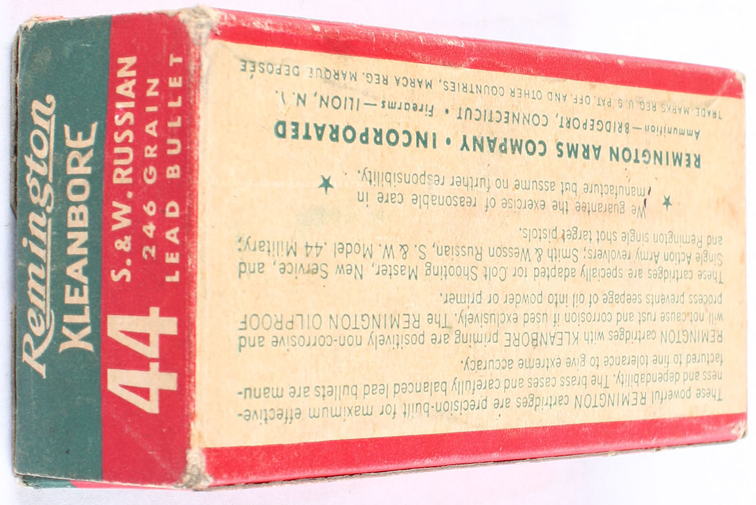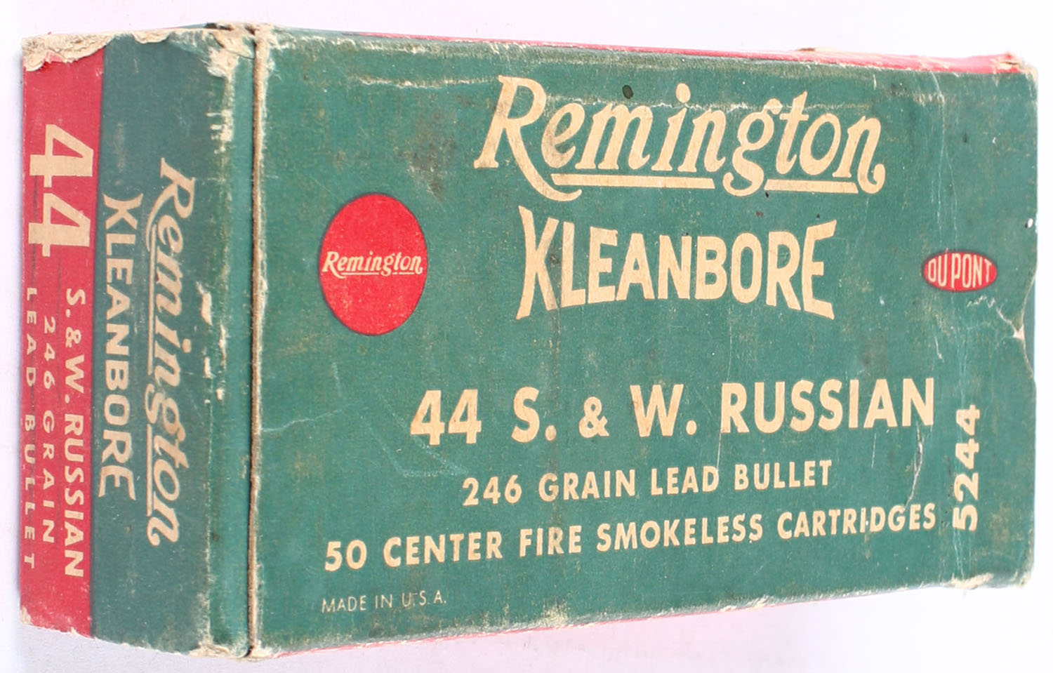 Remington, Kleanbore, .44 S&W Russian, 246 Grain Lead Bullet, Full, 1pc. Green red & white box, box is solid with excellent color, some edge & corner wear, end flaps are solid, ammo is excellent. Grade: Excellent - Value: 30 to 90
