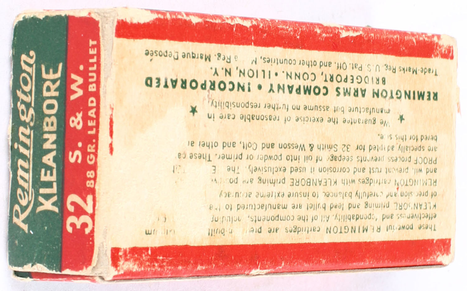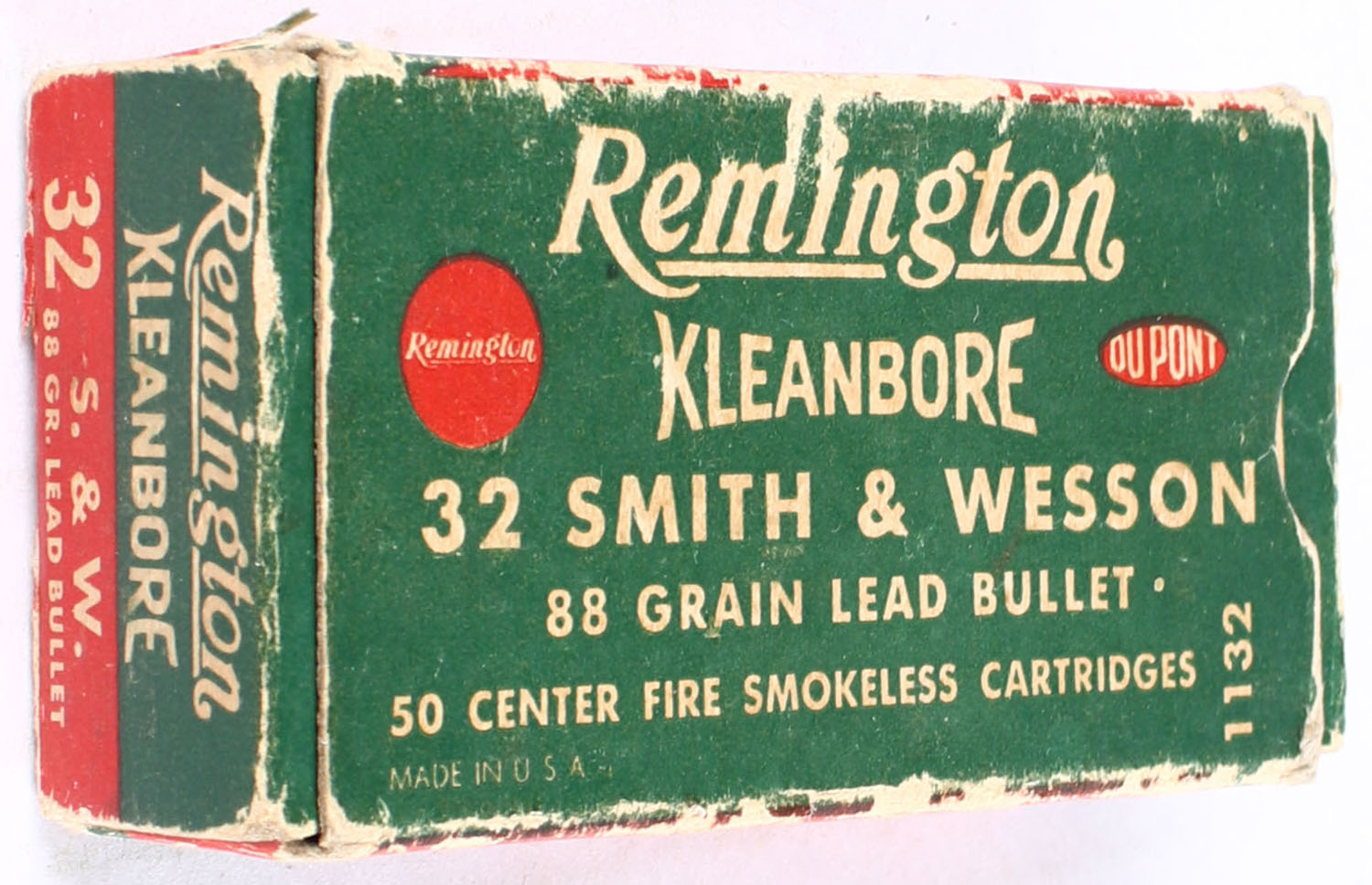 Remington, Kleanbore, .32 Smith & Wesson, 88 Gr. Lead bullet, 1pc, Full, Green, red, & white box, box is solid, has edge & corner wear, end flaps are solid, ammo is very good. Grade: Very Good - Value: 20 to 60