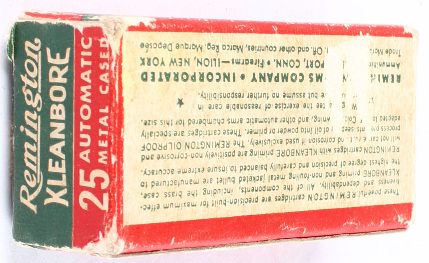 Remington, Kleanbore, .25 Automatic, 50 Grain Metal Cased Bullet, Full, 1pc. Green buff & red box, box is solid with very good to excellent color, minor age soiling & corner wear, edges are mostly crisp, end flaps are solid, ammo is minty. Grade: Very Good - Value: 20 to 30