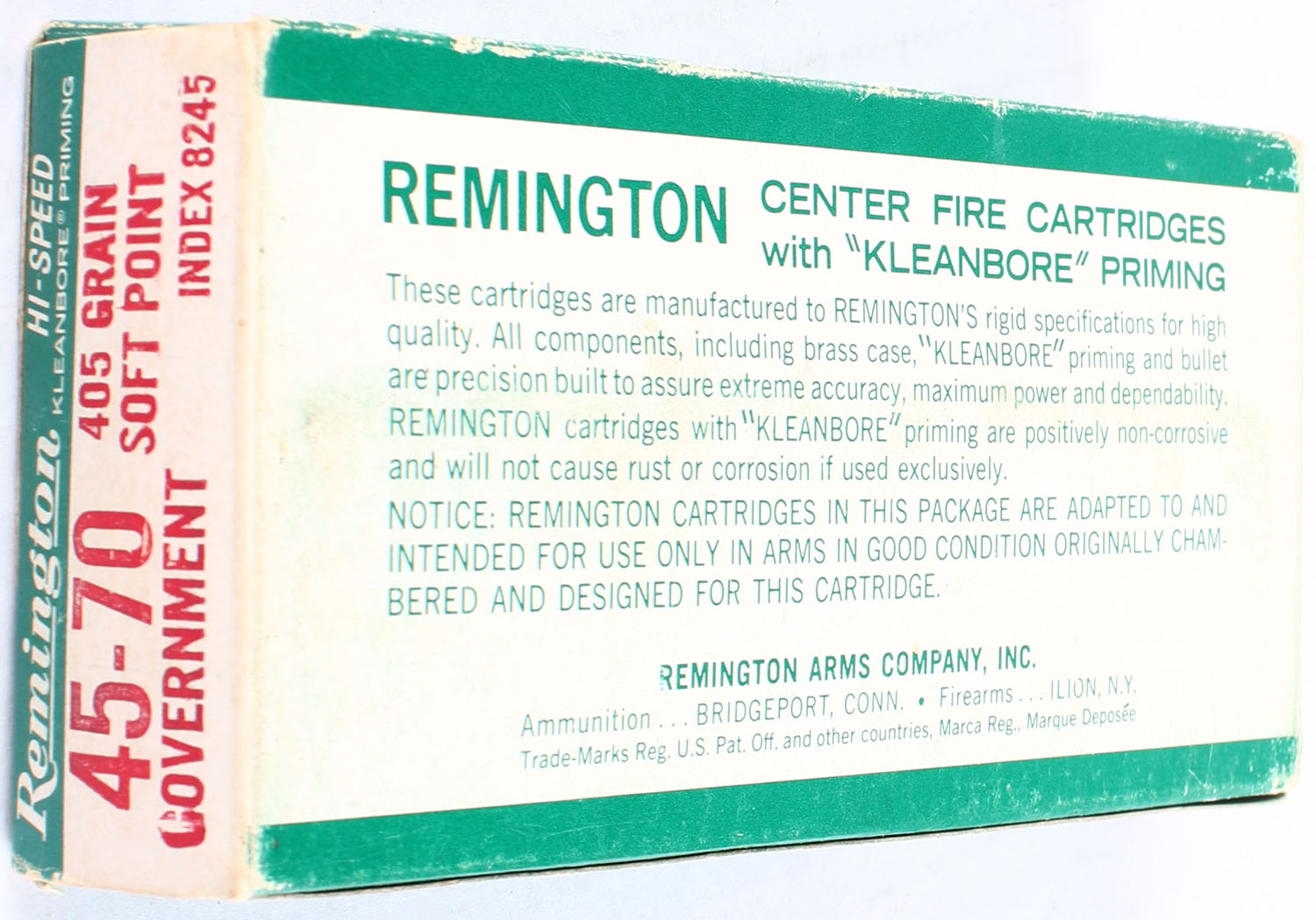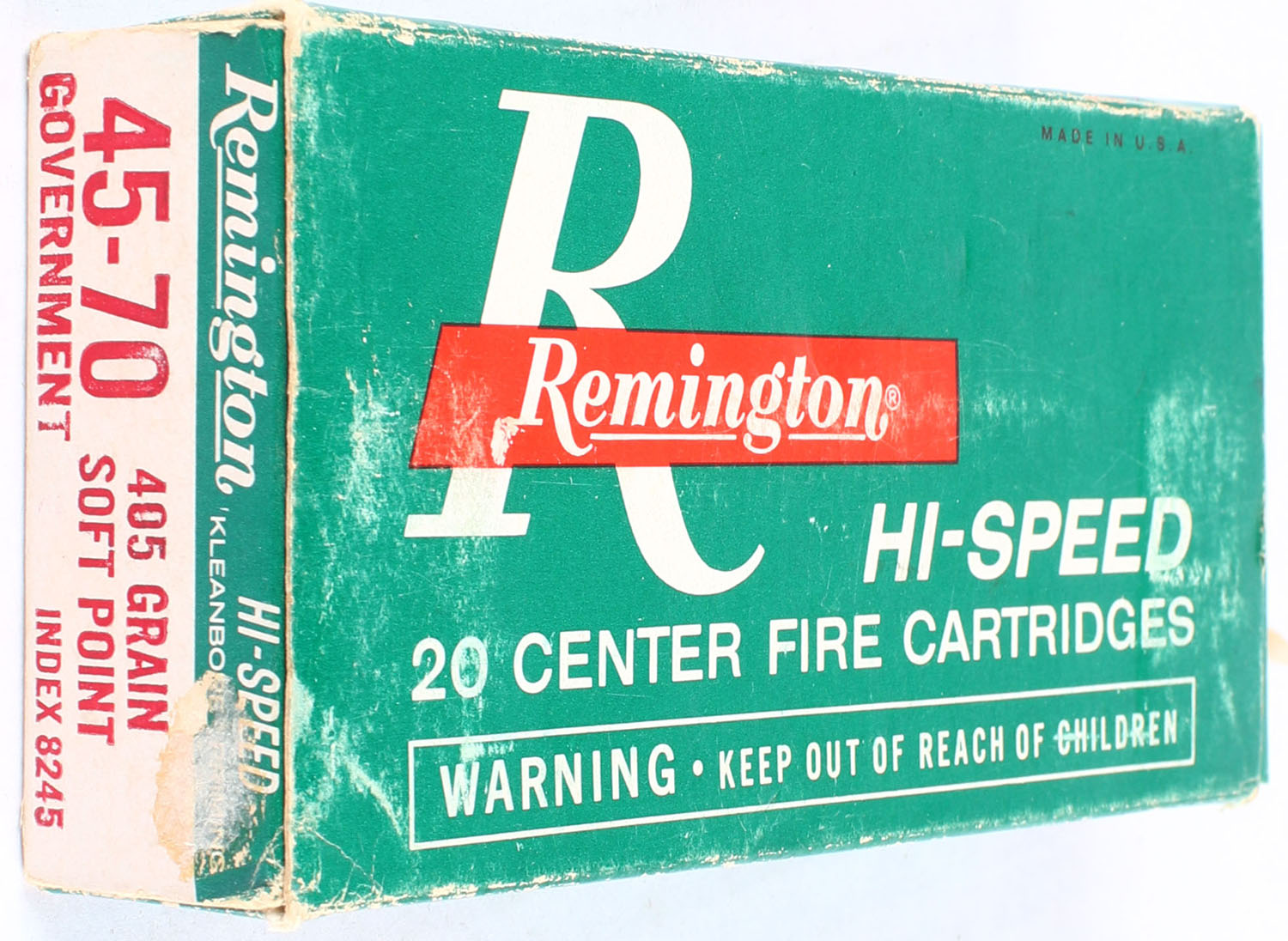 Remington, Hi-Speed, .45-70 Government, 405 Grain Soft Point, Full, 1pc. Green white & red box, box is solid with excellent color, very minor age soiling, has corner & edge wear, end flaps are solid, ammo is excellent. Grade: Very Good ++ - Value: 20 to 60