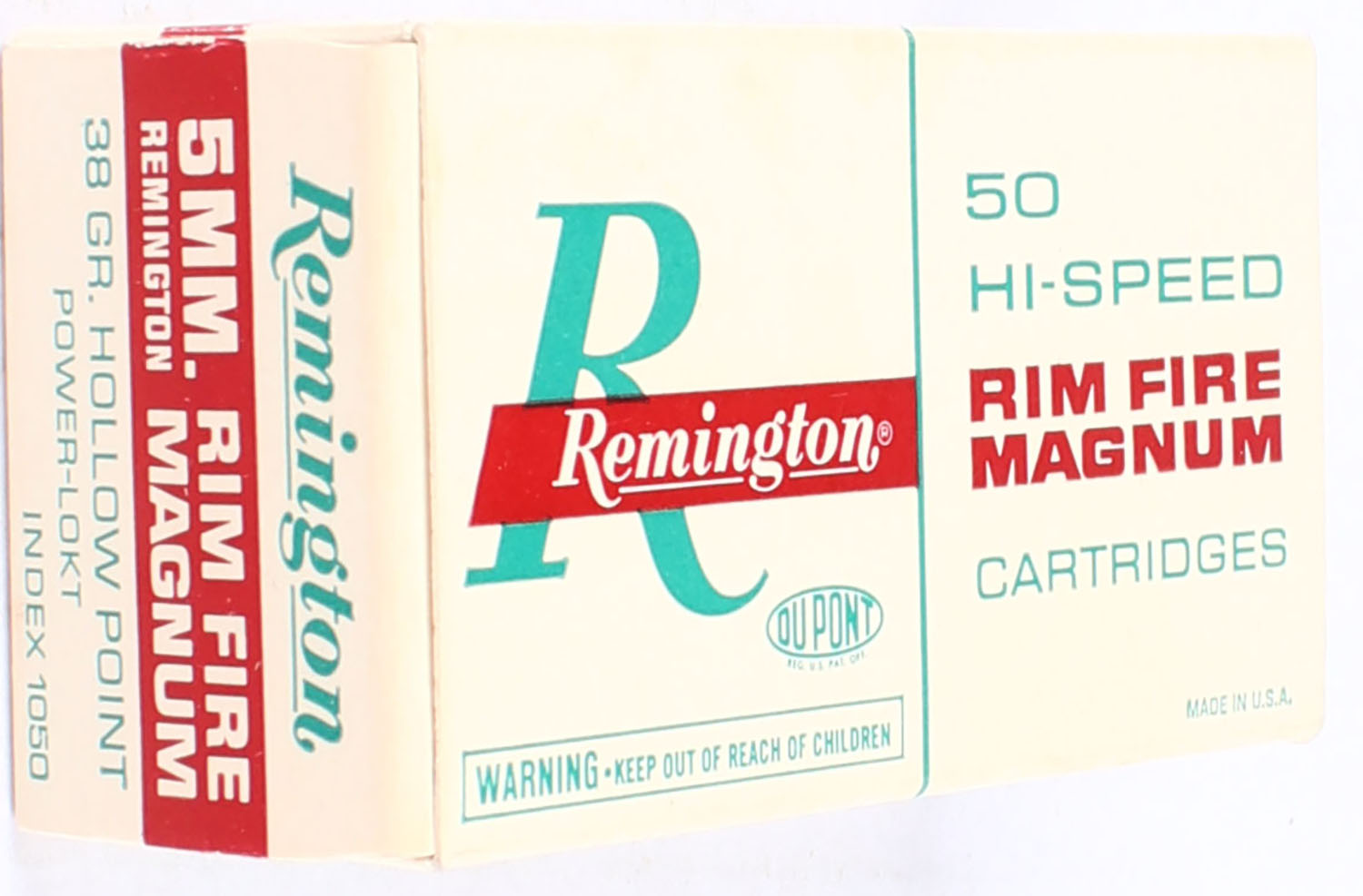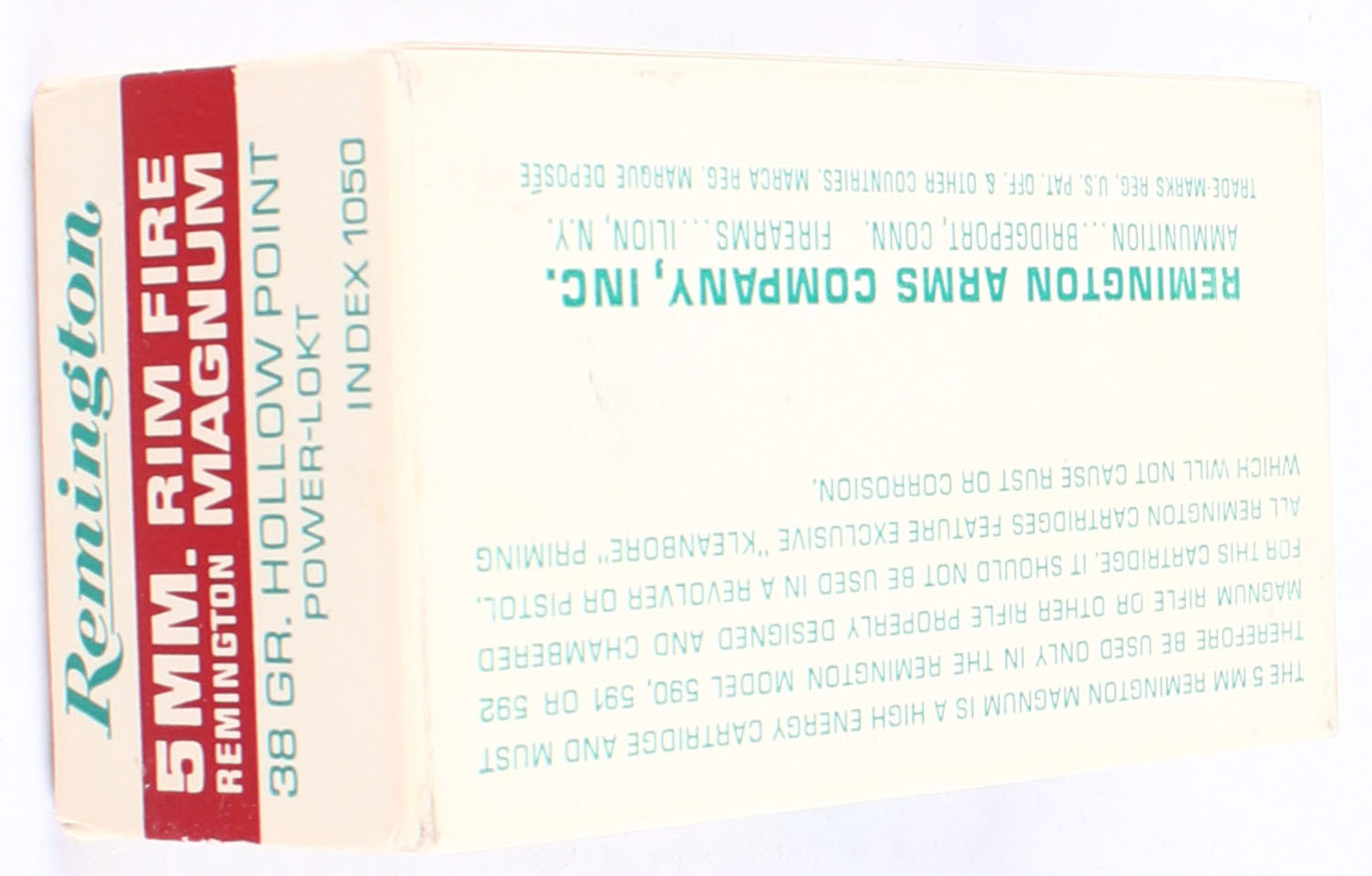 Remington, Hi-Speed, 5mm Remington Rim Fire Magnum, 38 Grain Hollow Point Power-Lokt, Full, 1pc. White red & green box, box is very solid with excellent colors, corners are sharp, end flaps are solid, ammo is minty. Grade: Excellent ++ - Value: 50 to 100