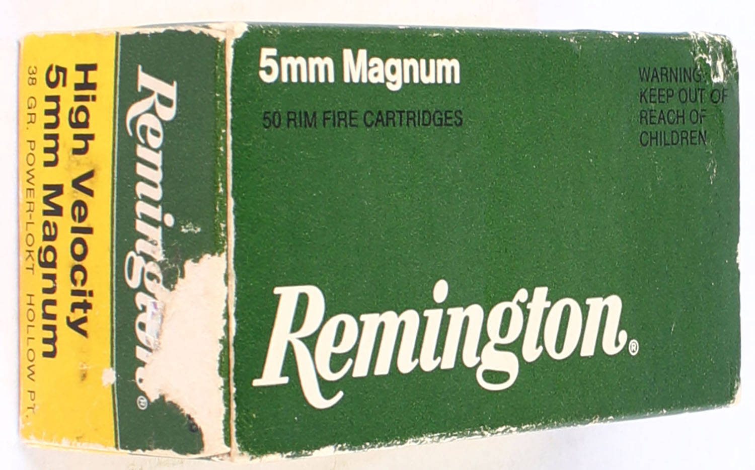 Remington, High Velocity, 5mm Magnum, 38 Grain Power-Lokt Hollow PT, Full, 1pc. Yellow, green, white & black box, box is very solid with light rub marks, end flaps are solid, ammo is excellent. Grade: Excellent - Value: 20 to 60