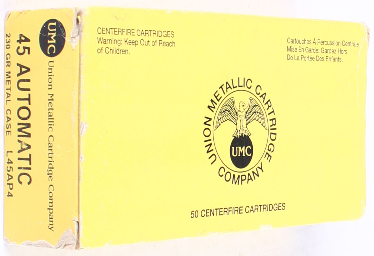 UMC .45 Auto, 230 Grain Metal Case, Full, 1pc., Yellow & black boxes, boxes are very solid, and flaps are solid, ammo is excellent. Grade: Excellent ++ - Value: 10 to 20