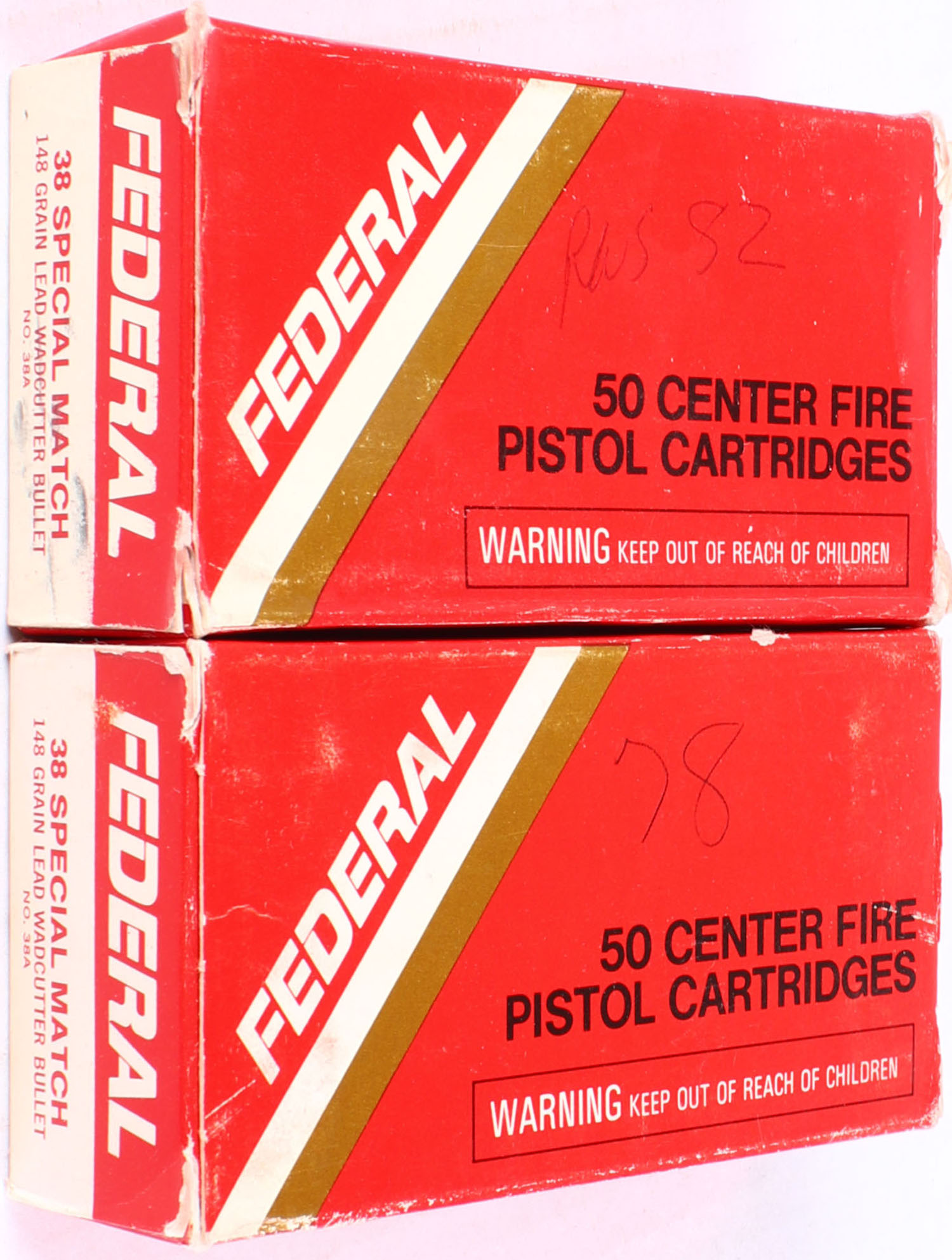 Lot of 2 Federal, 38 Special Match, 148 Grain Lead WC, Full, 1pc. Multi-colored box, box is solid with scuffing, end flaps are solid, ammo is excellent. Grade: Excellent - Value: 20 to 50