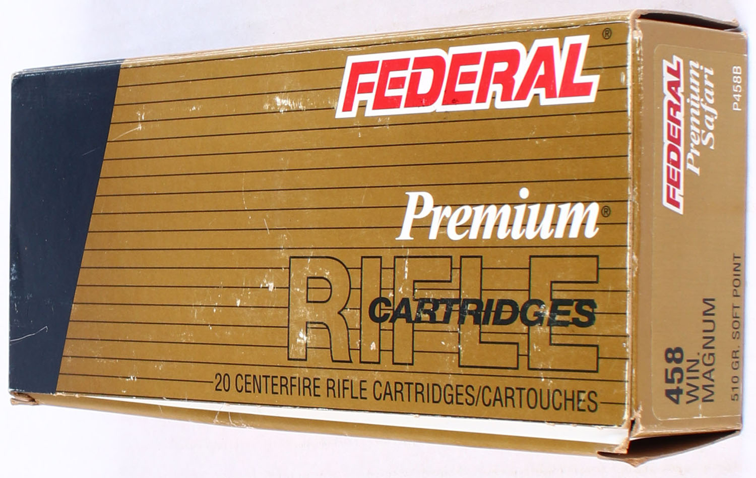 Federal, Premium, .458 Win Mag, 510 Grain SP, Full, 1pc. Multi-colored box, box has scuffing with great color, end flaps are solid, ammo is excellent. Grade: Excellent - Value: 40 to 100