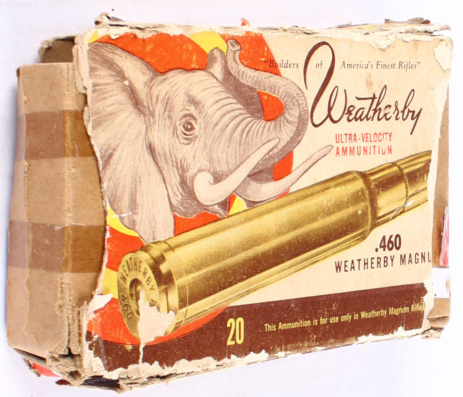 RARE! Weatherby, Ultra-Velocity Ammunition, .460 Weatherby Magnum., Partial 13 rds., 1pc., multi-colored Elephant box, box is falling apart, missing both end flaps with rips and tears to edges, inside box is weak with tape repairs, ammo is excellent. Grade: Good - Value: 100 to 200