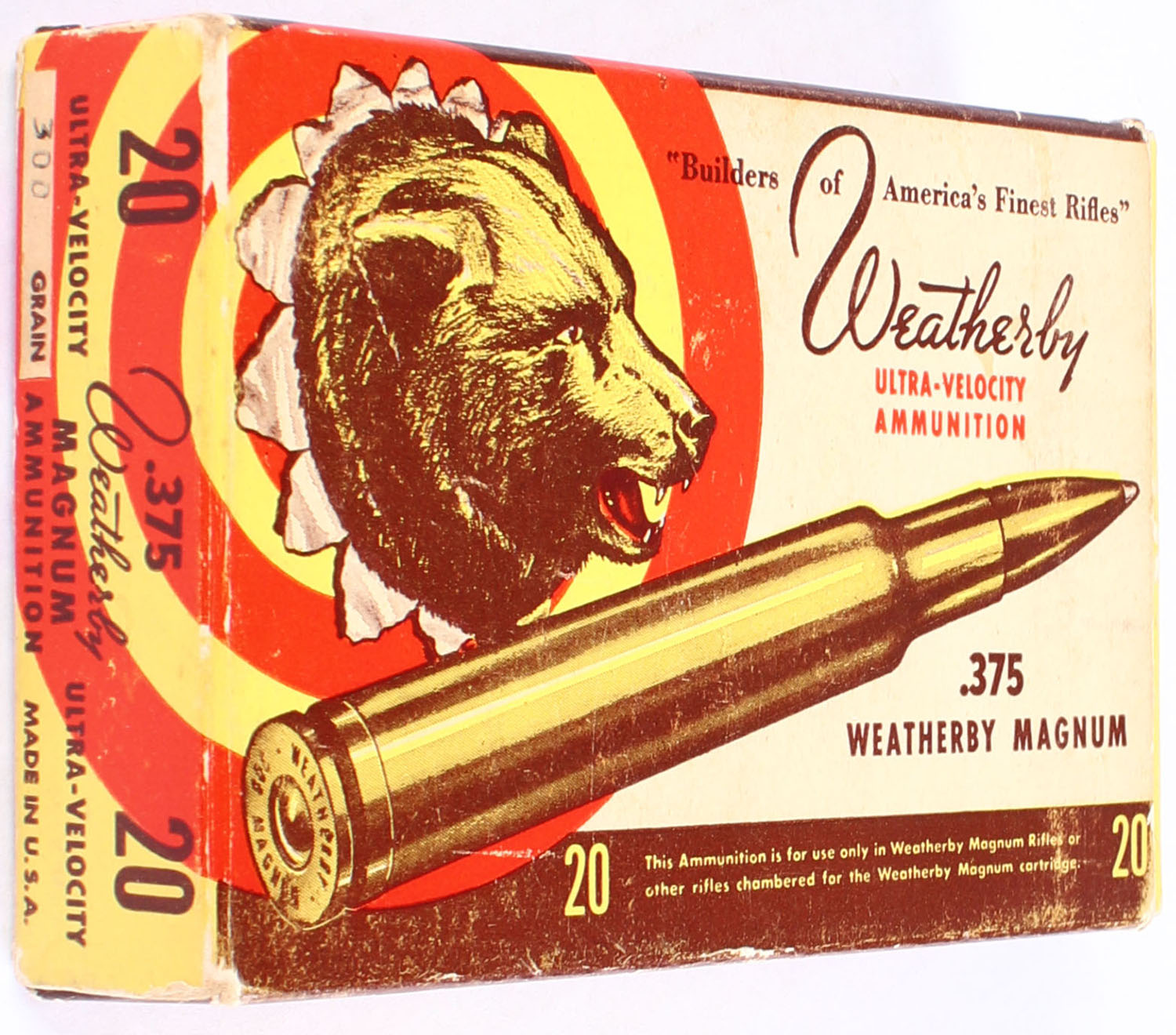 Weatherby, Ultra-Velocity Ammunition, .375 Weatherby Magnum., 300 Grain Soft Point, Full, 1pc., multi-colored BEAR box, box is solid with very good color, some scuffing, end flaps are solid, ammo is excellent. Grade: Very Good ++ - Value: 40 to 80