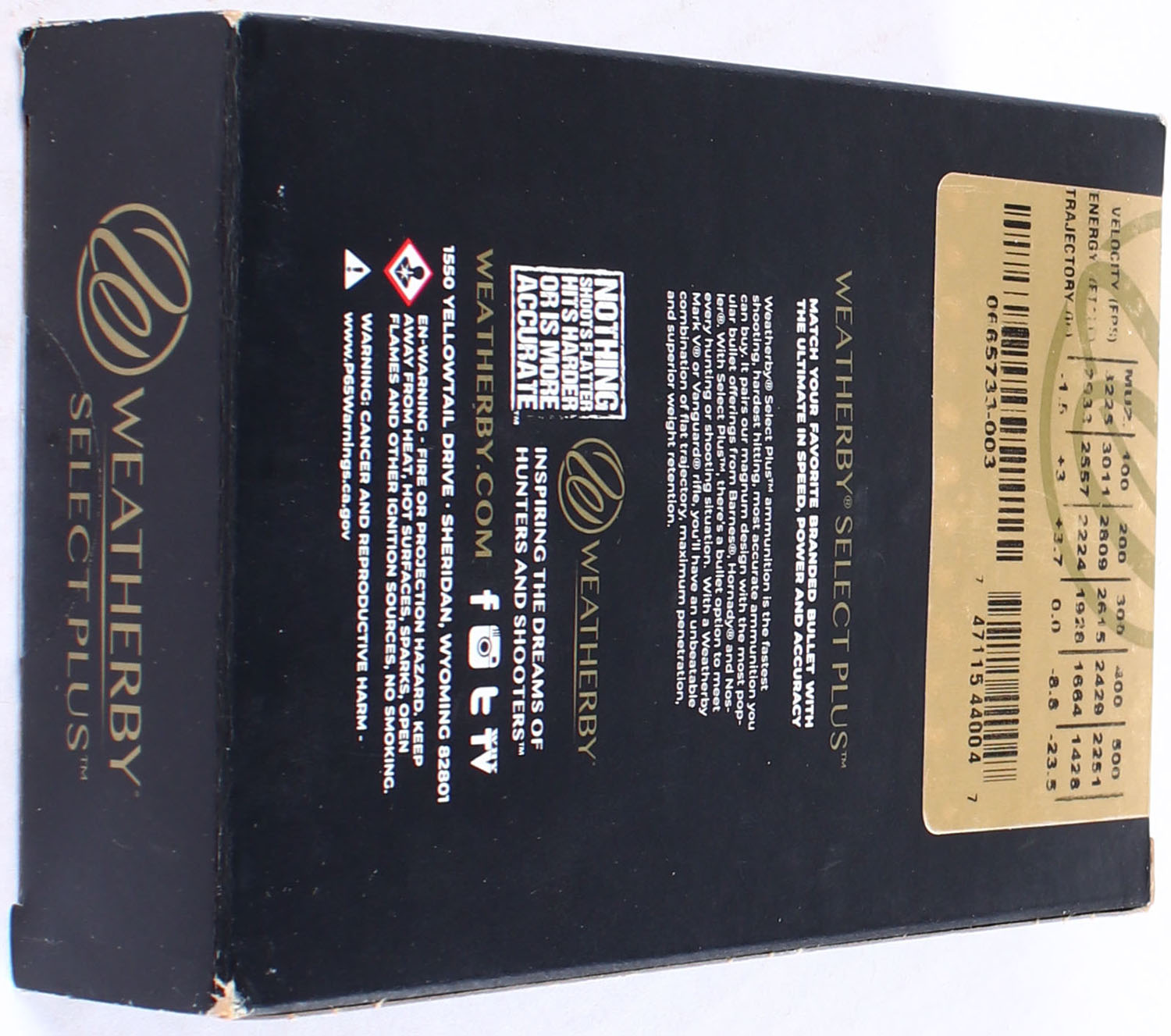 Weatherby Select Plus, Ultra-High Velocity Ammunition, 6.5 Wby RPM, Barnes 127 LRX, Full & SEALED, 1pc. Multi-colored box, box is solid with excellent color. Grade: Excellent ++ - Value: 40 to 100