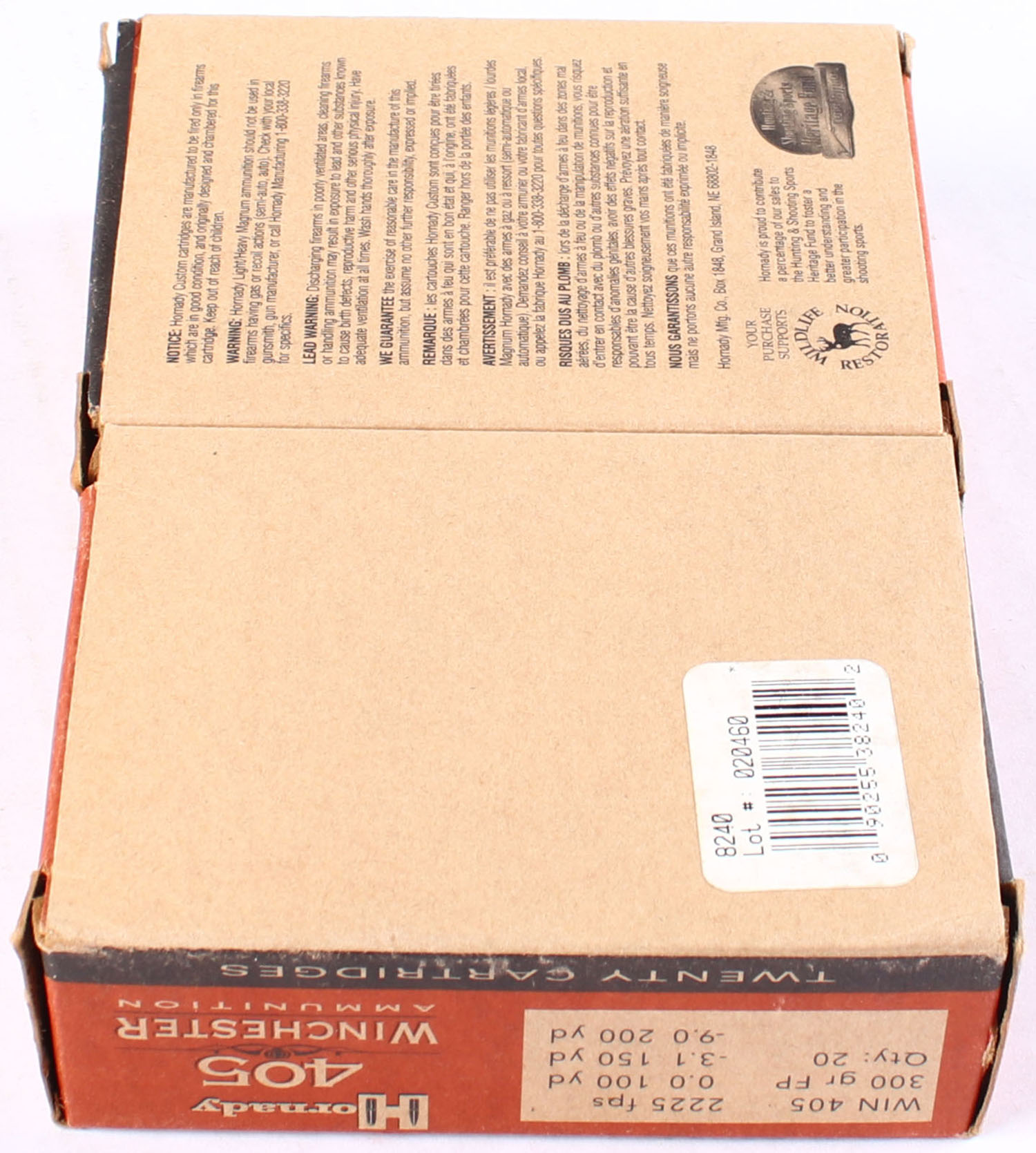 Hornady, .405 Win, 300 Grain Flat Point, 2225 FPS, Full, 1pc. box is solid with excellent color, end flaps are solid, ammo is excellent. Grade: Excellent - Value: 40 to 80