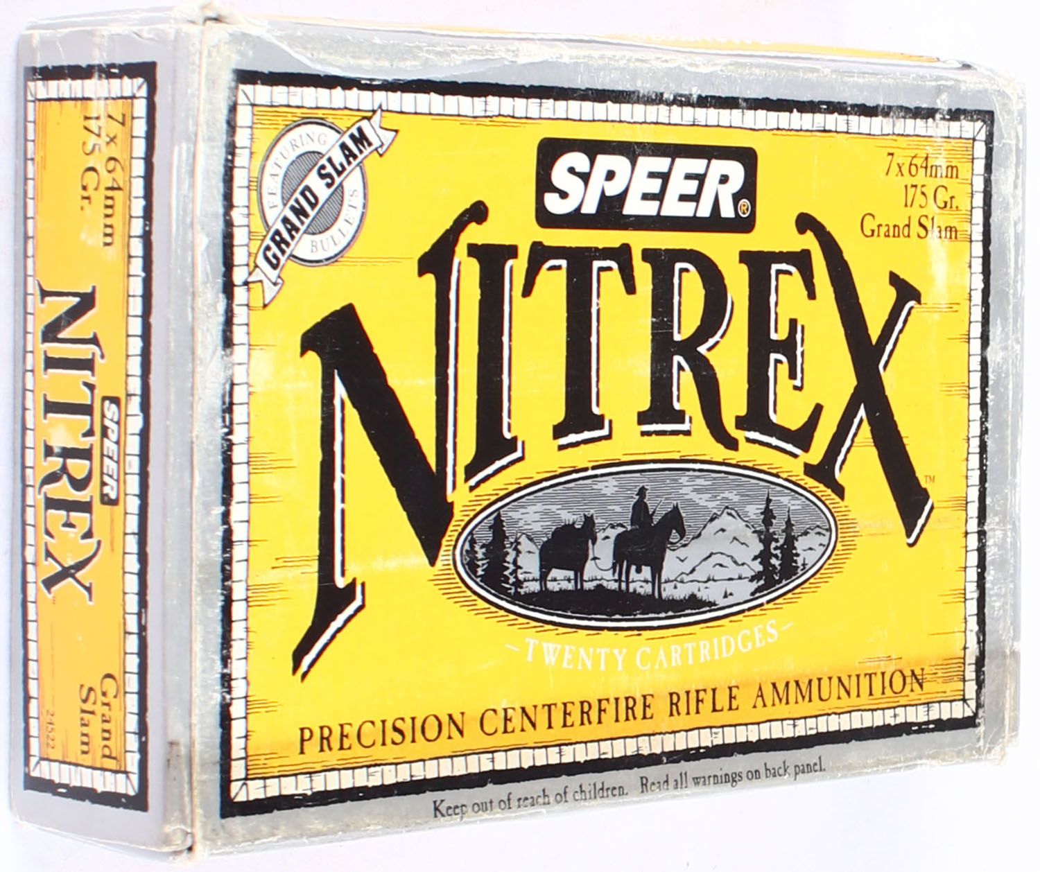 Speer, Nitrex, 7 x 64mm, 175 Grain, Full, 1pc. multi-colored box, box is very solid with excellent color, Ammo is excellent. Grade: Excellent - Value: 20 to 50