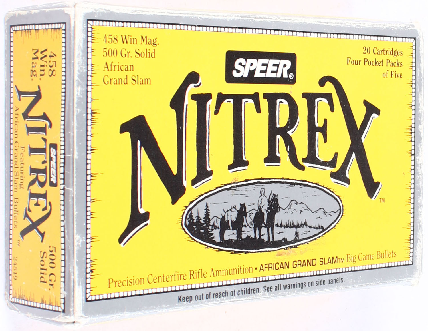 Speer, Nitrex, .458 Winchester Mag., 500 Grain, Partial 19rds, 1pc. multi-colored box, box is very solid with excellent color, Ammo is excellent. Grade: Excellent - Value: 30 to 80