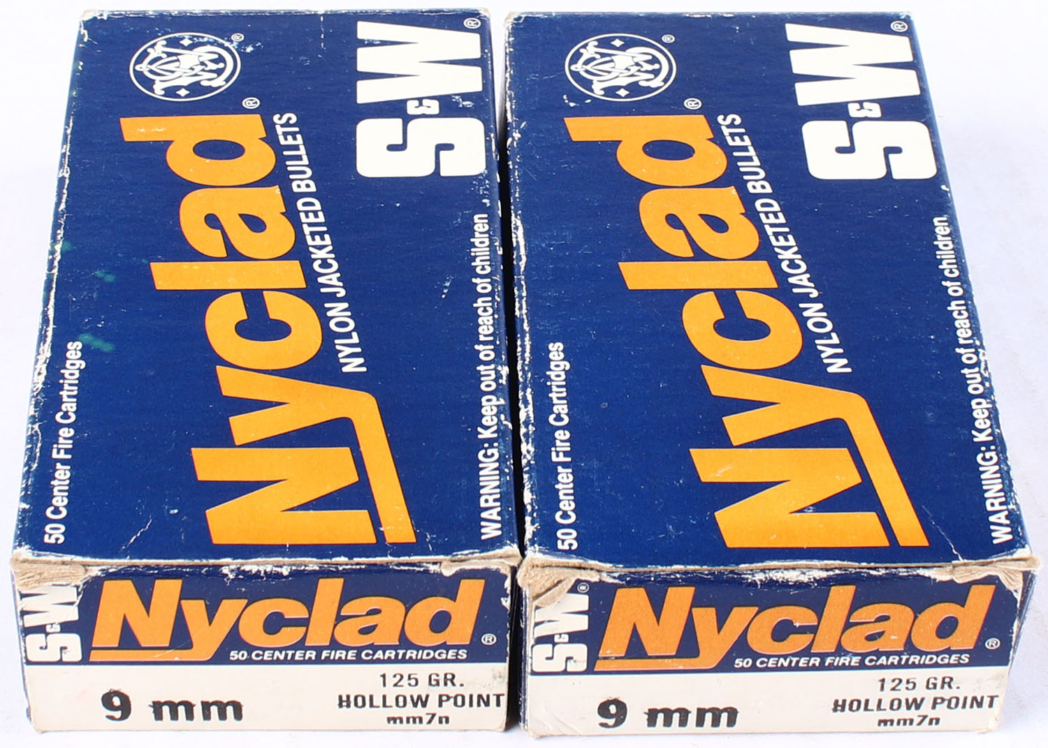 S&W, Lot of (2), 9mm, 125 Grain HP., Partial 81rds., 1pc., multi-colored boxes, boxes have shelf wear, Ammo is very good. Grade: Very Good - Value: 24 to 40