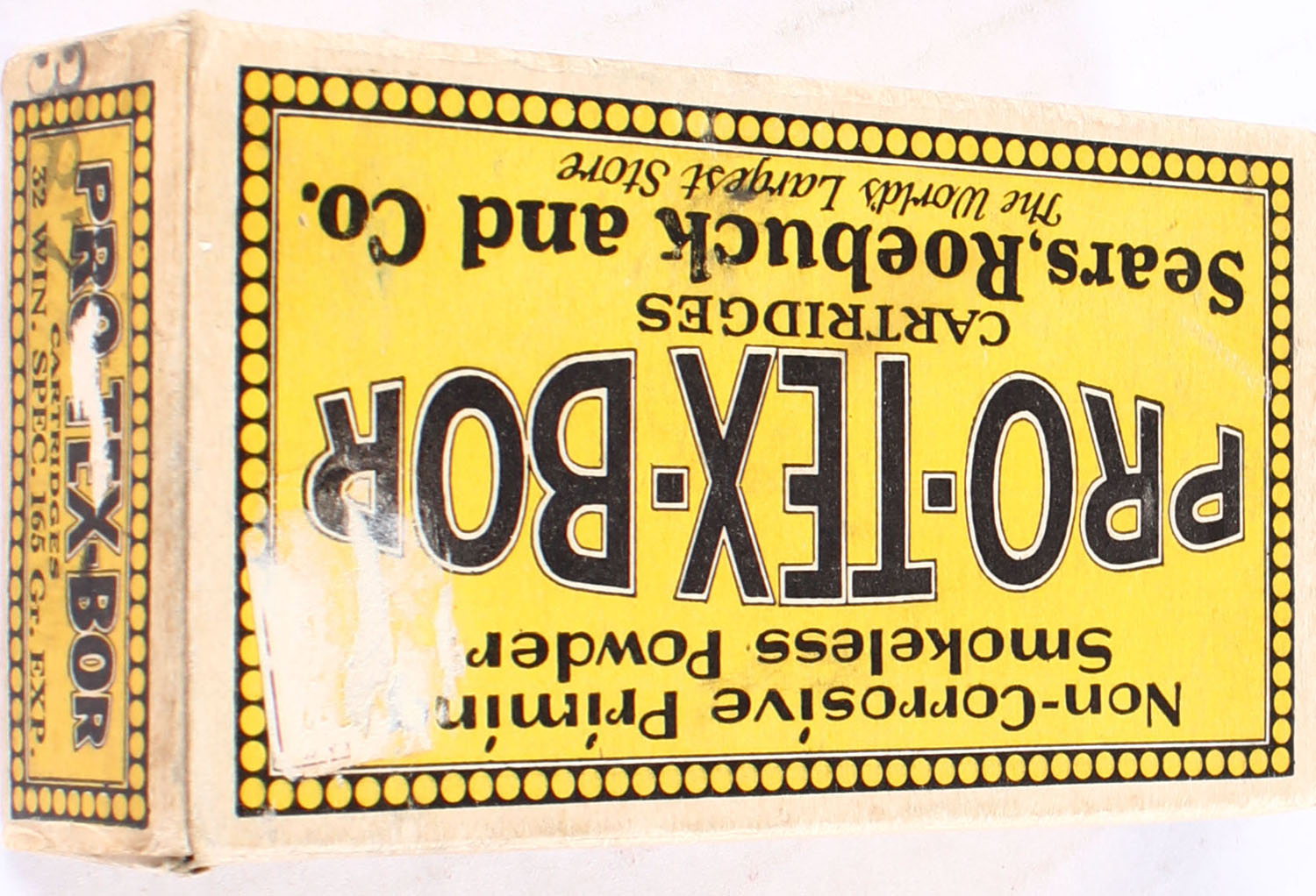 Sears, Pro-Tex-Bor, .32 Win. Special, 165 Grain Expanding, Full, 1pc., Multi-color box, box is solid with excellent color, ammo is excellent. Grade: Very Good ++ - Value: 24 to 40