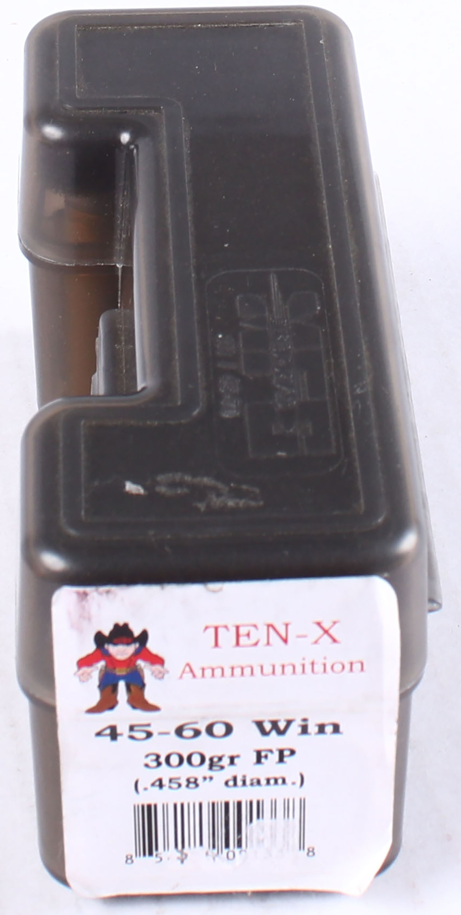 Ten-X Ammunition, 45-60 Win., 300 Grain FP, Full, 1pc., Grey Plastic box with label on end, box is solid, ammo is excellent. Grade: Excellent - Value: 20 to 40