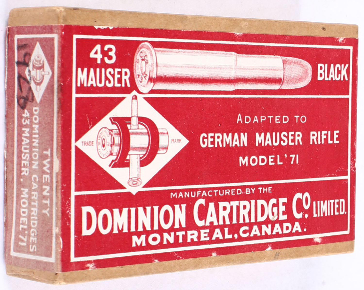 Dominion Cartridge Co., .43 Mauser Black, Full & Sealed, 2pc, buff box with red and white label, box is very clean with minor wear, light scuffing to bottom label. Grade: Very Good ++ - Value: 40 to 100