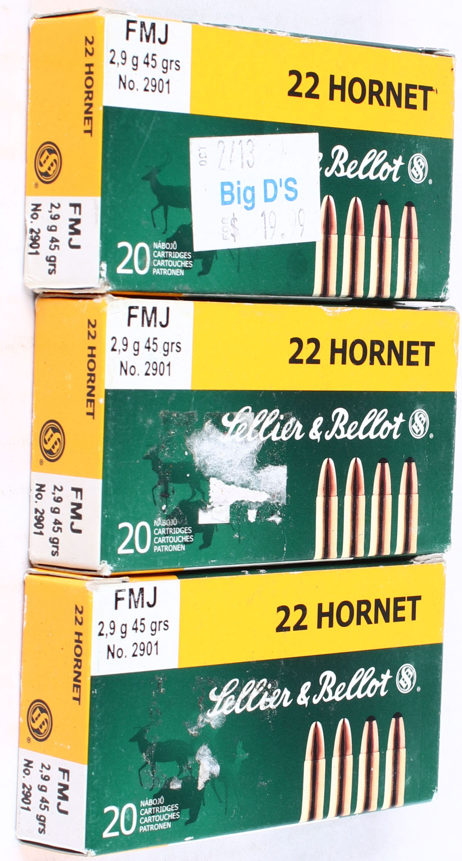Sellier & Bellot, Lot of (3), .22 Hornet, 45 Grain, Full, has scuffing, ammo is excellent. Grade: Excellent - Value: 50 to 100