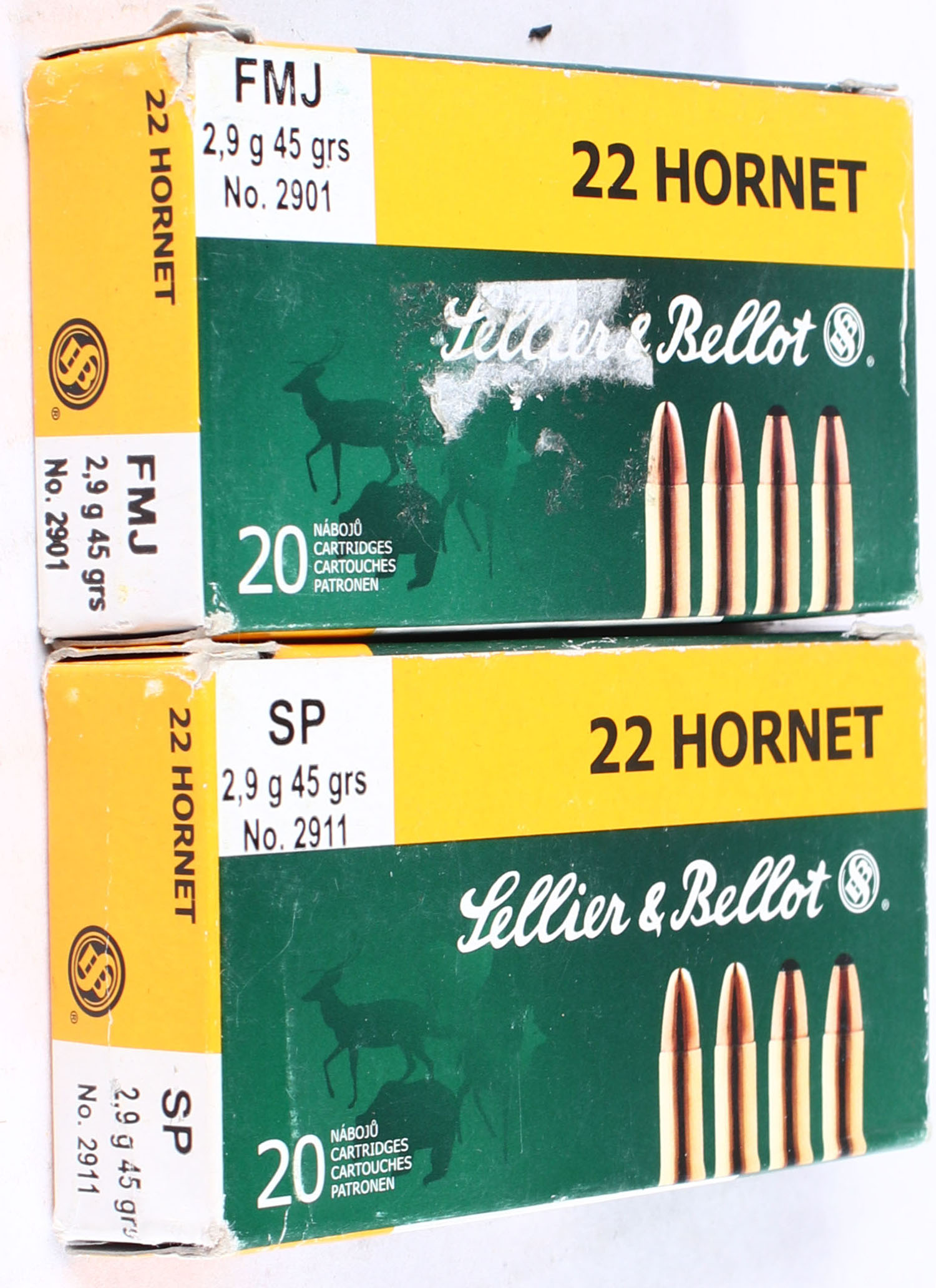 Sellier & Bellot, Lot of (2), .22 Hornet, 45 Grain, Full, has scuffing, ammo is excellent. Grade: Very Good - Value: 20 to 80