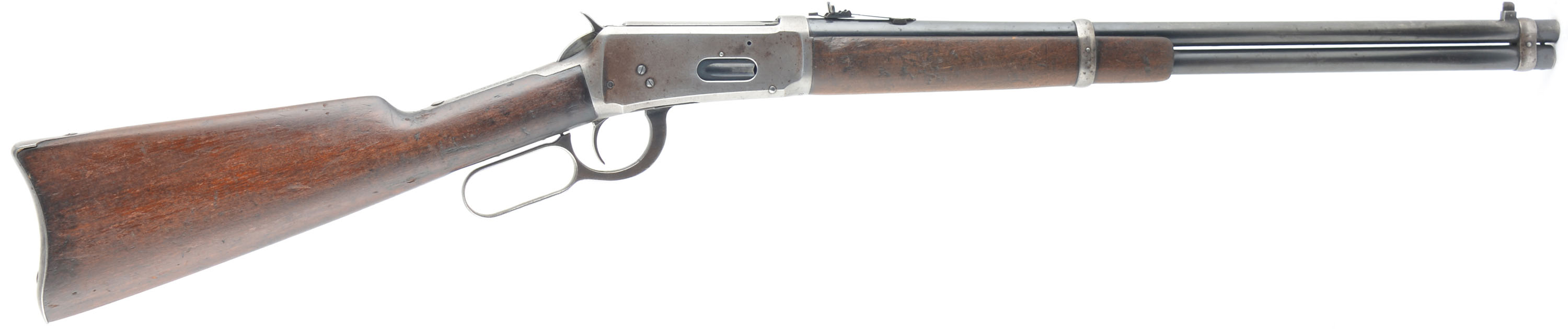 Winchester, Model 1894 SRC, CAL: 25-35 WCF, MFG: 1919, SN: 887979, Lever Action Carbine, 20'' Round barrel, Full mag. The straight grip wood stocks are very good & solid, with numerous minor to small scrapes, scratches, gouges & contusions to the wood & original finish. The original metal blue finish rates 70% on the barrel & mag, while the receiver has worn mostly gun metal gray, with a few areas of thin brown patina. Bore is very good. Fitted with a D.W. King adjustable rear sight & carbine box front sight. Buttstock carries a smooth carbine metal buttplate. Original saddle ring. Smooth tight action. A solid old & original SRC. FFL or C&R Req. - Value: 600 to 1200