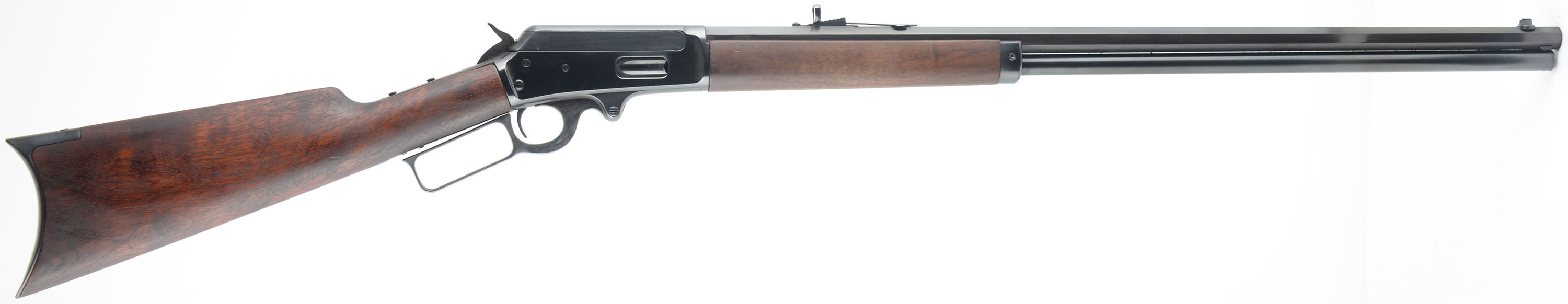 Marlin, Model 1893, .32-40, MFG. 1903, SN: 273729, Lever Action Rifle, 26'' Octagon barrel, Full mag. The wood stocks are excellent & solid, as being previously sanded & refinished. There are very few minor handling marks remaining & the stocks have a darkened aged appearance. There is a thin missing sliver of wood at the upper right corner of wrist. The reblued metal finishes rate 98%, with some light cleaned pitting scars remaining under blue. Bore is very good. The barrel carries a King full buckhorn adjustable rear & Lyman small blade front sights. Crescent metal buttplate. Tight smooth action. Another good looking refurbished old west rifle. FFL or C&R Req. - Value: 800 to 1500