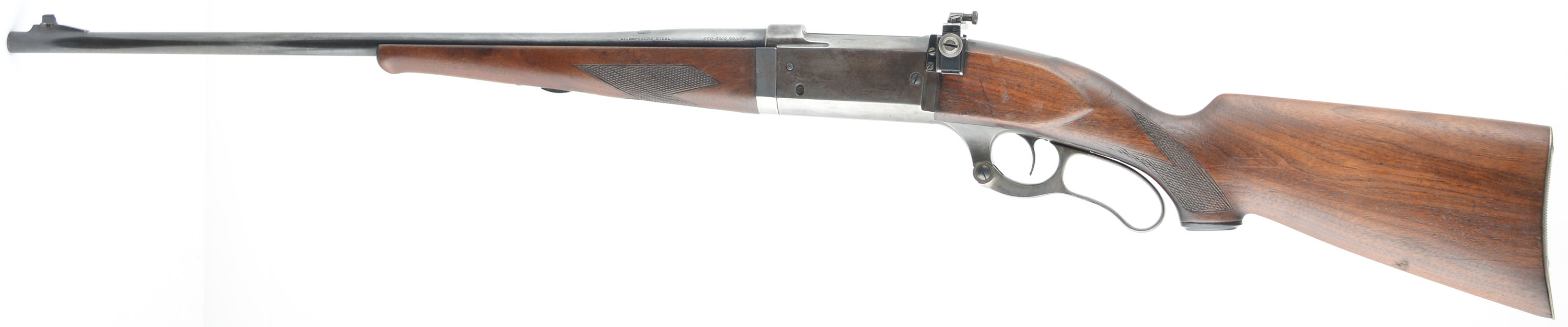 Savage, Model 99 Take-down, CAL: 250-3000 SAV, MFG: 1927, SN: 305762, Lever Action Rifle, 22 1/4'' round barrel. The original checkered & capped pistol grip wood stocks are excellent. There is a small chip & 1/2'' crack at the toe, a small gouge on the belly of the stock & other minor handling marks, scratches & contusions to the original finish. The original metal blue finish on the barrel rates 40%, while the receiver has worn mostly gun metal gray with a thin brown patina. The case-hardened lever has also worn mostly gray, but with remnants of case-colors. Bore is excellent & bright. The receiver holds a side mounted Redfield peep sight, while the barrel has a lead filled rear dovetail & ramp elevated blade front sight. The stock carries the original serrated metal buttplate. A quality vintage take-down lever. FFL or C&R Req. - Value: 600 to 1200