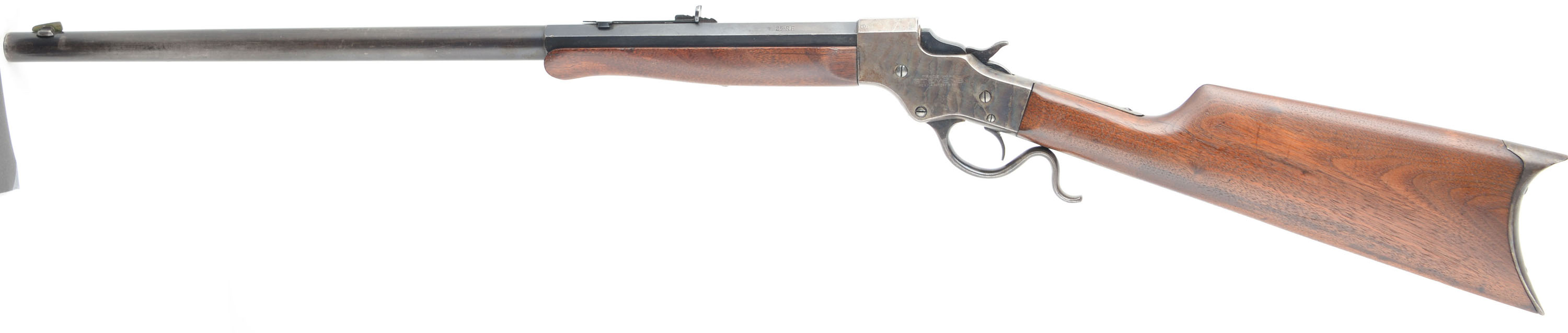 J. Stevens A. & T. Co., Model No. 44, Cal: 25 RF, MFG: 1894 - 1933, SN: 71007, Single Shot Rolling Block, 24'' Octagon to round barrel. The original straight grip wood stocks are very good, as lightly sanded & refinished. There are very few light scratches or handling marks to the current finish. There is a fill repair at the forward right side of the wrist & a few glue repaired hairline cracks to the forend. The right side of barrel is stamped ''J. STEVENS ARMS. & TOOL. CO. CHICOPEE FALLS.MASS. USA.'', while the left side is stamped ''25-RF''. The SN is stamped on both the lower tang & the barrel. The original metal blue finish to the barrel rates 60%, with most of the loss found on the muzzle half, with some brush lines & chatter marks. The case-colored receiver displays muted case-colors. The barrel carries an adjustable rear & Rocky Mountain front sights. Bore is very good, with roughness amongst strong rifling. Stock carries a crescent metal buttplate. A nice looking Stevens 44 rifle. FFL or C&R Req - Value: 400 to 800