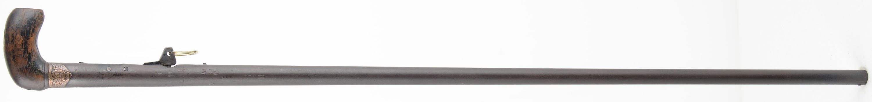 RARE J.P. Hubbard-London Day's Patent Can Gun, 50 cal, Circa 1827-35. No SN, Percussion, 28 1/4'' Barrel length. 34 3/4'' overall cane length, plus 11'' if mounted with screw on shoulder stock. The handle measuring 3 1/4'' long. The ''J.P. Hubbard-London Day's Patent Can Gun'' is a walking stick firearm, also known as a cane gun, that was popular in Britain during the first half of the 19th century. It utilized a ''Day's Patent'' ignition system, patented by John Day around 1823. This system was incorporated into various types of firearms including these types of cane gun. This example was manufactured by J.P. Hubbard, at his London address. Disguised as simple a walking canes, these were primarily marketed to urban gentleman for personal protection, but also to farmers & thus the screw on buttstock. These were muzzle-loading, percussion firearms with iron barrel, under hammer & trigger system, with curved walnut one piece grip handle. The under hammer design was likely used to keep the powder dry. The cane gun carries a medallion on the back left side of the barrel, which features an embossed coat of arms, with a lion & unicorn, & marked ''(J.)P. Hubbard 26 Newgales - Days Patent''. The trigger & hammer system extend from the barrel when the ring is pulled, engaging the tension spring. Once the trigger is pulled, the hammer drops onto a percussion cap previously affixed to the nipple. Mechanism appears to function properly, although the ring is a modern replacement. The piece shows a chocolate brown patina, with some spotty remnants of black finish on both the barrel & the walnut handle. The stock suffered a wrist break & has been glue repaired & further strengthen with screws & rivets. Stock carries the original metal buttplate. An authentic survivor of a bygone era, which is extremely rare, especially with the original accompanying stock. Antique, No FFL Req. - Value: 1000 to 2600