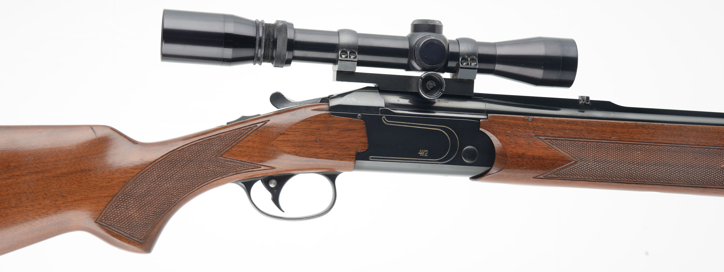 Valmet, Model 412 Double Rifle, CAL: 300 Win Mag, MFG: Modern, SN: 219657, Break Action O/U Double Rifle, 23 1/8'' barrels. This rifle is apparently started as a 30-06, but was gunsmith rechambered to 300 Win Mag, with the current caliber marked on the left side of lower barrel inside the receiver. The original checkered & flat pistol grip Monte Carlo style stock is excellent, with minor scratches, rubs & contusions to the excellent original finish. The original metal blue finish rates 90% overall, with most of the loss found on the belly edges & left side of receiver. The receiver has gold tone fill accenting the lettering & receiver embellishments. Bores are excellent. The receiver is mounted with a Burris 2X-7x scope, while the barrel's solid rib holds a folding rear sight & triangle blade front sight. The stock carries the original Valmet ventilated recoil pad. Sling mounting provisions & comes with a very nice padded sling. A high condition & quality Finnish made double rifle. FFL Req. - Value: 800 to 1500