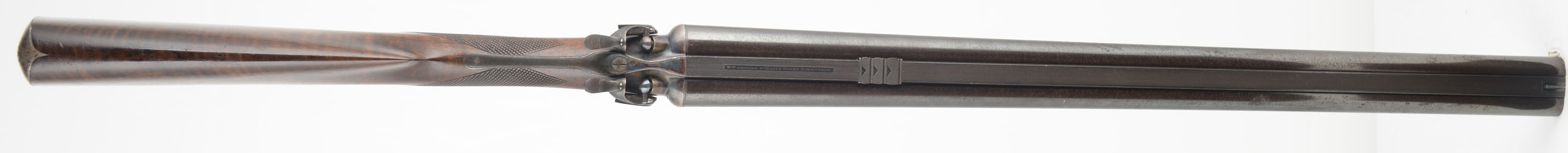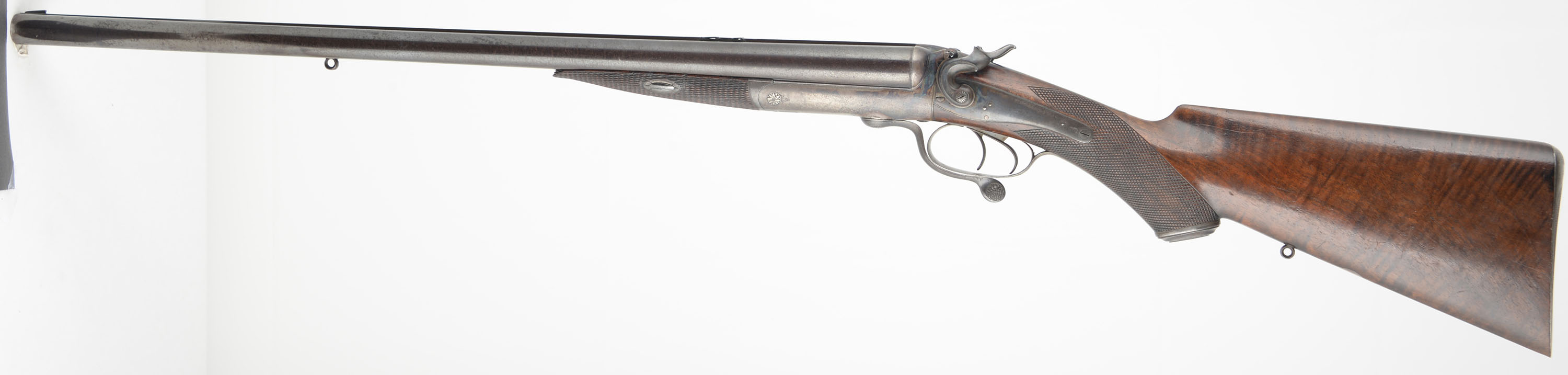 FANTASTIC W.W. GREENER, Model Hammer Double Rifle, CAL: 16 Bore, MFG: Ca. 1870 or at least the early 1870's. Antique, SN: 8717, Under Lever Break Double Hammer Rifle, 25'' Laminated Steel barrels, 10.2 lbs. While WW Greener records for the period prior to 1880 do not contain much information, but according to internet information, this 16-bore double rifle was made in 1871 & featured their patented self-retracting striker mechanism (Greener's solution to the tendency for firing pins in the early centerfire era to stick in the soft primers of cartridges of that time, effectively bolting the gun closed after discharge). Self-retracting striker shotguns & rifles were made by W.W. Greener between 1868 & 1875 & most had Jones under-lever opening mechanisms. Shotguns of this type are not common & rifles are quite rare.