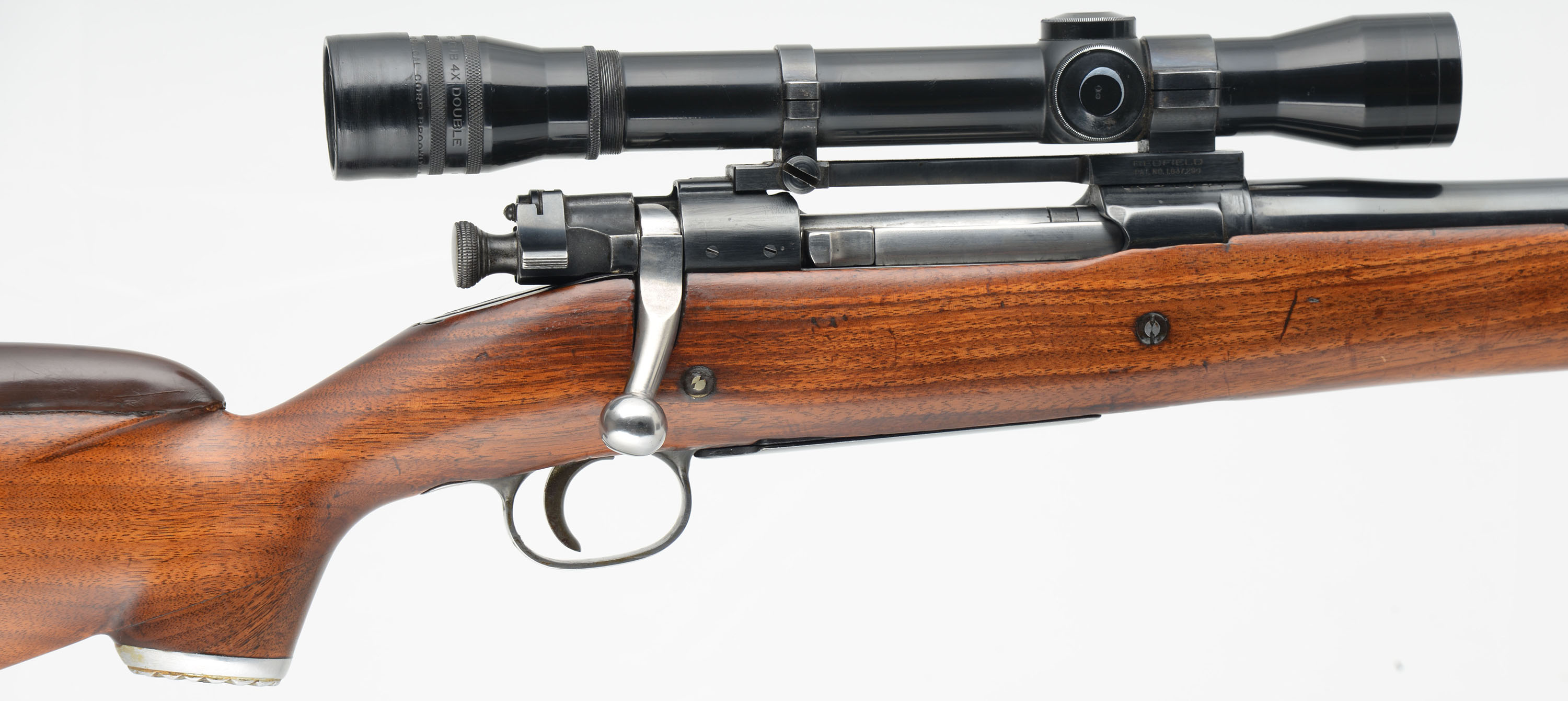 Remington, Model 1903 Sporterized, CAL: 30-06, MFG: 1943, SN: 3341547, Bolt Action Rifle, 20 1/2'' barrel. The altered & customized original stock has an added cheek & metal capped pistol grip, with is very good & solid. The stock has been cut down & given a schnabel style forend tip. The wood shows several minor scrapes, scratches & contusions to the finish. The metal blue finish rates 75% overall. Bore is good, with spots of roughness amongst thinning rifling. The receiver carries a Stith Mounts Bear Cub 4X Double scope mounted on Redfield mounts, while the barrel has no open sight provisions. Buttstock carries a White-Line ventilated recoil pad. Sling loops. This rifle has a worn trigger sear, which allows the striker to drop when moving the bolt after the rifle is cocked. It cannot be safely unloaded & could easily misfire, therefore is not safe. This rifle will require gunsmith repair to function properly & thereafter is being sold ''AS-IS'' with no returns. FFL or C&R Req. - Value: 200 to 400