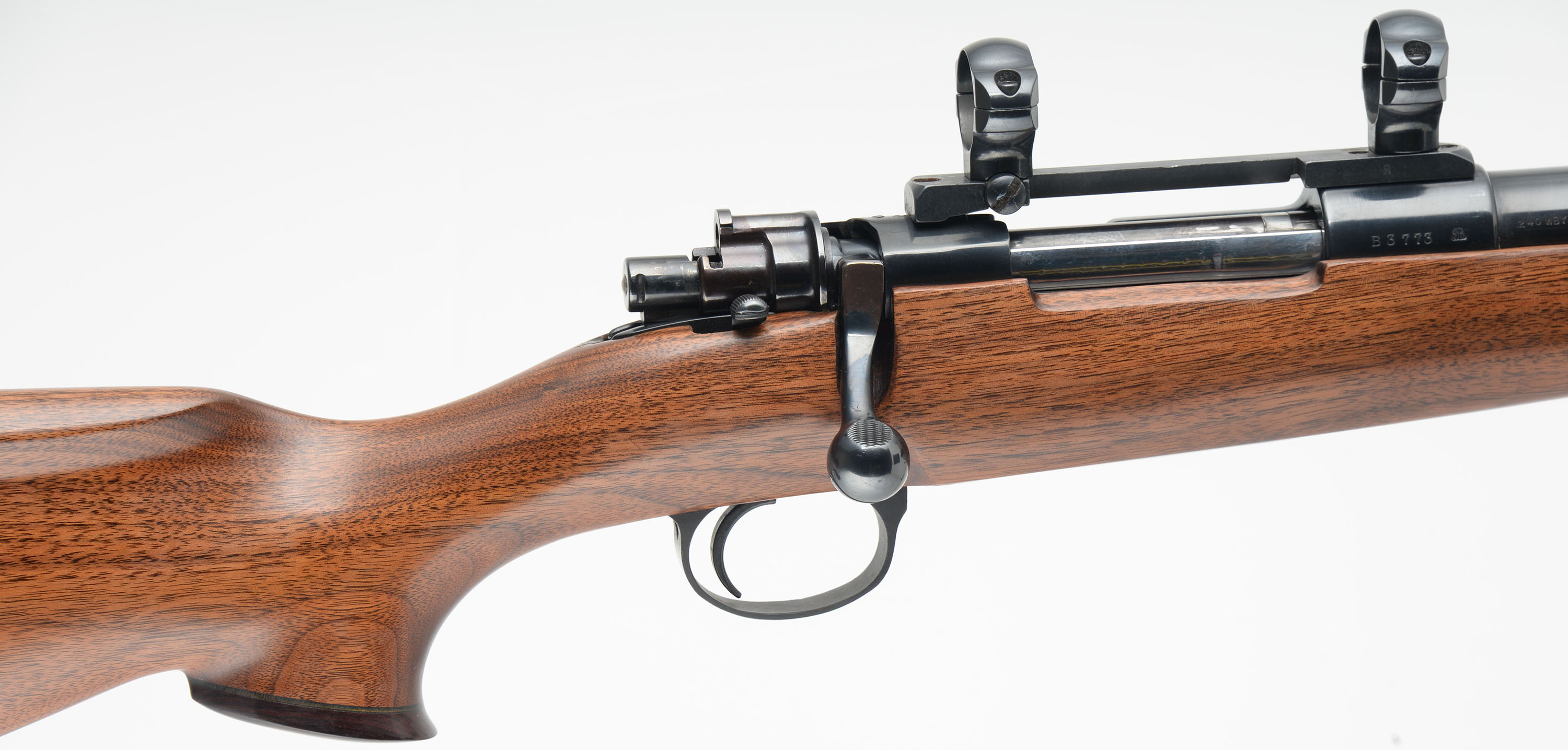 Custom DWM, Model: 1909 Argentino Mauser Action, Cal: 240 Weatherby, MFG: 1910 German, S/N: B3773, Bolt action Rifle, 22 1/2'' barrel. The custom cheeked & flat pistol grip Monte Carlo stock is excellent, with the rosewood slant cut forend tip & pistol grip cap. Its features give the custom stock has the appearance of a Weatherby style stock. The deluxe wood displays excellent grain & has very few tiny handling marks to the excellent overall finish. The metal blue finish rates 95% overall, with some cleaned pitting under the blue on the floorplate. The left side of receiver is marked ''MAUSER MODELO ARGENTINO 1909'', ''DEUTSCHE WAFFEN-UND'', ''MUNITIONSFABRIKEN BERLIN'', right side of receiver is marked with S/N, Left side of the barrel is stamped ''M. Robinson''. Bore is excellent & bright. The receiver carries a set of rings on a Redfield bar mount, while the custom barrel carries no open sight provisions. The stock carries a Decelerator solid rubber recoil pad. Excellent overall & nicely built. FFL or C&R Req. - Value: 400 to 800