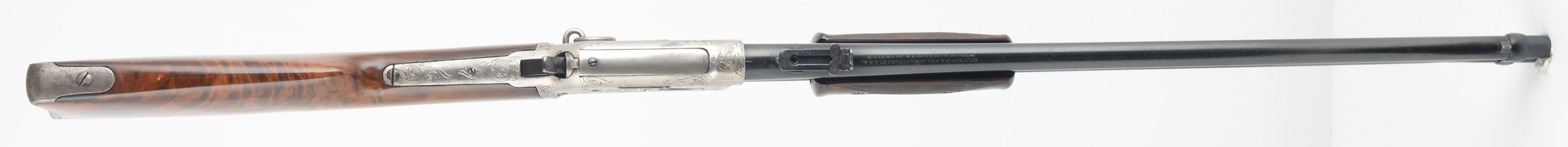 ENGRAVED Colt Lightning, Medium Frame, SADDLE RING, Marked 44 Cal., MFG: 1890, SN: 49138, Pump Action Rifle, 20 1/4'' Round barrel. This rifle was custom engraved & refinished. The original straight grip wood stocks are very good, with correct checkered forend & non-checkered stock. The stock has been sanded & refinished, displaying fantastic rippled & contrasting grain. The forearm appears to carry the original finish, with an added thin layer of finish. The stocks have minor scratches, nicks & contusions. The receiver, trigger guard, buttplate & forend sliding bar have all been polished & left in the white, with some remains of cleaned pitting. The receiver has been hand engraved with a scroll & fan motif, also featuring a bear on the right & boar on the left. The barrel & mag tub have been buffed & reblued, retaining approximately 80% coverage of the blue. There is cleaned pitting, abrasions, contusions & dents under the reblue, with additional spotting loss. Bore is fair, with spotty areas of cleaned pitting or roughness amongst rifling. The barrel holds a box blade front sight & a flip-up slide adjusting ladder sight. The rear ladder sight is mounted backwards & displays considerable pitting under the refinish. Buttstock carries a carbine style metal buttplate. Mechanically tries to lock-up in the rear cocking position & is loose or fails to lock up in the forward position after working the action. The rifle has not been test fired, may need some adjustment. Antique, No FFL Req. - Value: 1500 to 3000