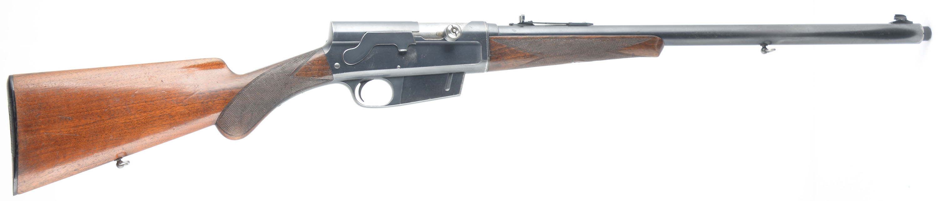 RARE FN (Fabrique Nationale), Model 1900 No-Rib Variation, .35 Rem Cal., MFG. 1910-36, SN: 2011, Semi-Auto Rifle, 22'' barrel, In Belgium it was known as ''La Carabine Automatique Browning'', in Germany it was the ''Selbstladebchse Browning Kaliber 9mm'', but in the U.S. we know it simply as the F.N. 1900. Records indicate only 4,913 Model 1900's were ever produced. While records indicate 2909 rifles were produced for the years 1910-21, with no allocation to a particular year during that time, it is likely that SN 2011, a mid 1910's production rifle. This rifle, invented by John Browning, was one of Europe's first successful semi auto high-power rifle. FN obtained the rights to produce the rifle as early as 1902, however, they chose to focus their production efforts on the A5 shotgun, which they acquired production rights to at the same time. They correctly viewed greater consumer sales potential in the A5. By 1904 restrictive importation tariffs into the U.S. caused Browning to negotiate with FN to allow manufacture of his shotgun within the U.S. The Remington Arms Co. was eager to work with John Browning & acquire the rights to manufacture both his autoloading shotgun & his autoloading rifle. FN was first to introduce the long-recoil shotgun (A5), but it was Remington that first produced John Browning's long-recoil rifle in 1906, dubbed the ''Autoloading Rifle'' or more commonly known today as the Model 8. If the Remington Model 8 is the grandfather of American semi-automatic sporting rifles, the F.N. 1900 is its European twin. The FN model 1900 was marketed throughout the world except the U.S., while the model 8 was intended for the U.S. market. Production comparisons place the model 8 at around 70,000, nearly a 14 to 1 difference. Since the FN was not sold in the U.S. market, few examples of the limited 4913 total produced are found amongst collectors in the U.S. It is known that some were vet bring-backs from two World Wars & at least a few were imported by Val Browning into the US. Since the FN was exported to Canada, some have made their way south of the border. Regardless of how they arrived, they are rare & very desired amongst Remington 8 & 81 collectors. Produced with old-world craftsmanship, these rifles are a testament to Fabrique Nationale's word-wide reputation for manufacturing high quality firearms. It doesn't take long to notice there were probably more hours of labor involved in producing the FN over the Remington. A close inspection & disassembly of both rifles will reveal a significantly superior fit & finish with the Belgium made version, even over early production Model 8s. The FN came in two versions, neither of which were a higher grade than the other. One version, the most common, had a solid barrel rib running the length of the jacket, the other rarer variation had a standard barrel jacket like the Model 8 with no rib. This example is one of rarer mid production variations without the rib. These take-down rifles were often broken down into the 22'' & 20'' halves & placed into travel cases. The rifle has an English walnut round knob pistol grip stock & schnabel tip forend. Hand cut factory checkering is 20 lines-per-inch, with the early 1st style forearm checkering pattern. All hand fit & assembled. To that point, stocks do not always interchange one rifle to another & factory LOP can vary by as much as a full inch. The stocks original condition is excellent, with thinning finish wear, minor handling scuffs, scratches & contusions. The original metal blue finish is approximately 85% overall, with blue thinning at the carry points of the receiver & barrel, along with some minor scratches & abrasions. The left side of the receiver carries the factory roll stamp & proof markings. Bore is very good. Barrel is fitted with a Marble's rear sight & Marble's 37M elongated blade front sight. Original FN buttplate. Factory sling loops. Tight smooth action & functions as it should. An overall excellent & eye catching example of this rare & highly collectible mid production rifle. FFL or C&R Req. - Value: 3000 to 5000