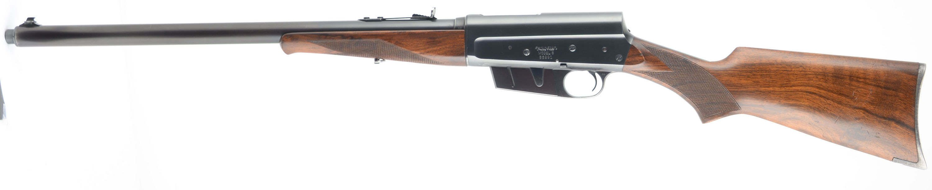 Remington, Model 8 ''C'' Grade (Deluxe), marked .32 Rem Cal., MFG: 1932, SN: 65991, Semi-auto take-down rifle, 22'' barrel, The original deluxe checkered & flat knob pistol grip wood stocks are excellent & solid. The inside of the forend is stamped with a 3 for grade ''3'' or ''C'' grade, & they display hand checkering cut at 20 lines per inch. This is a late production rifle & as a ''C'' grade, the stock still carries the cheeks at the wrist of the early production rifles. There are minor scrapes, scratches & contusions to the original finish, which also has a very thin layer of a protective added layer. The wood appearance is overall excellent. The original metal blue finish rates 95%, with the loss due to some density thinning on the safety, mag & lower tang. Some areas of the blue are starting to tone a lovely plum, which is typical of the late model 8 & early model 81 rifles. The barrel carries the standard adjustable rear & front sights. Bore is excellent, clean & bright. Stock carries the popular serrated lower tang crescent metal buttplate. 5 rd fixed magazine. Tight action. A rare & fantastic original ''C'' grade deluxe rifle, which is highly collectible. FFL or C&R - Value: 2500 to 3000