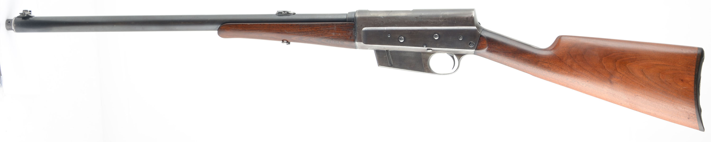Remington, Model 8, .25 Rem Cal (marked 25-35 Rem), MFG. 1909, SN: 14733, Semi-Auto Rifle, 22'' barrel. Although this rifle fires a .25 Rem rimless cartridge, it carries the original early & rarer .25-35 caliber marking. Remington tried to utilize the 25-35 marking to take advantage of the popularity of Winchester's 25-35 caliber. They were quickly forced to change their caliber marking to .25 Rem on later examples, as these rifles would not accept the rimmed 25-35 cartridges. This makes this early caliber marked rifle even rarer than the fairly rare standard .25. The original straight grip & schnabel forend stocks are excellent, with both appearing to carry the original finish. There are a few minor scuffs, scratches & contusions to the wood, with the forend showing most of that wear & some thinning of the finish. The original metal blue finish rates 60% on the barrel, with the finish on the receiver evenly thinned or worn to an even thin gray/brown patina. Bore is very good. Barrel is fitted with a Lyman dual folding leaf rear sight on the early oval base & a very unusual unmarked horizontal or windage adjusting front blade sight. 5 round fixed magazine. Tight smooth action. The rare early caliber marking makes this rifle very collectible. FFL or C&R Req. - Value: 800 to 1200