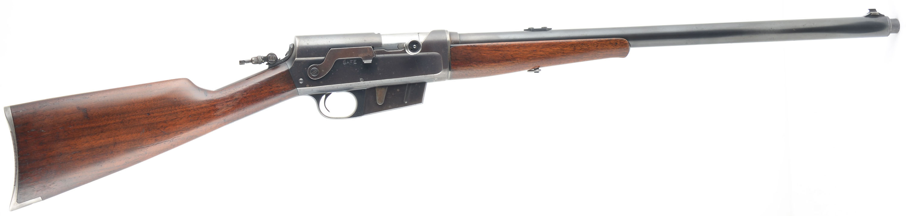 Remington, Model 8, .30 Rem Cal, MFG. 1934, SN: 66869, Semi-Auto Rifle, 22'' barrel. The original straight grip & schnabel forend stocks are excellent & solid. There are several minor to small scrapes, scratches & contusions to the wood & original finish, which has thinned from use & now carries an additional protective layer. The original metal blue finish rates 70% on the receiver, 85% on the barrel, with an area of cleaned pitting on the forward left side of the barrel which is covered with an added blue finish. Bore is very good. The receiver is fitted with a Marbles flip-up tang sight, while the barrel carries a Marble's filler blank in the rear sight provision & a standard blade front sight. Stock carries the popular bottom tang serrated crescent metal buttplate. 5 round fixed magazine. Tight smooth action. A very nice presenting standard rifle. FFL or C&R Req. - Value: 600 to 1000